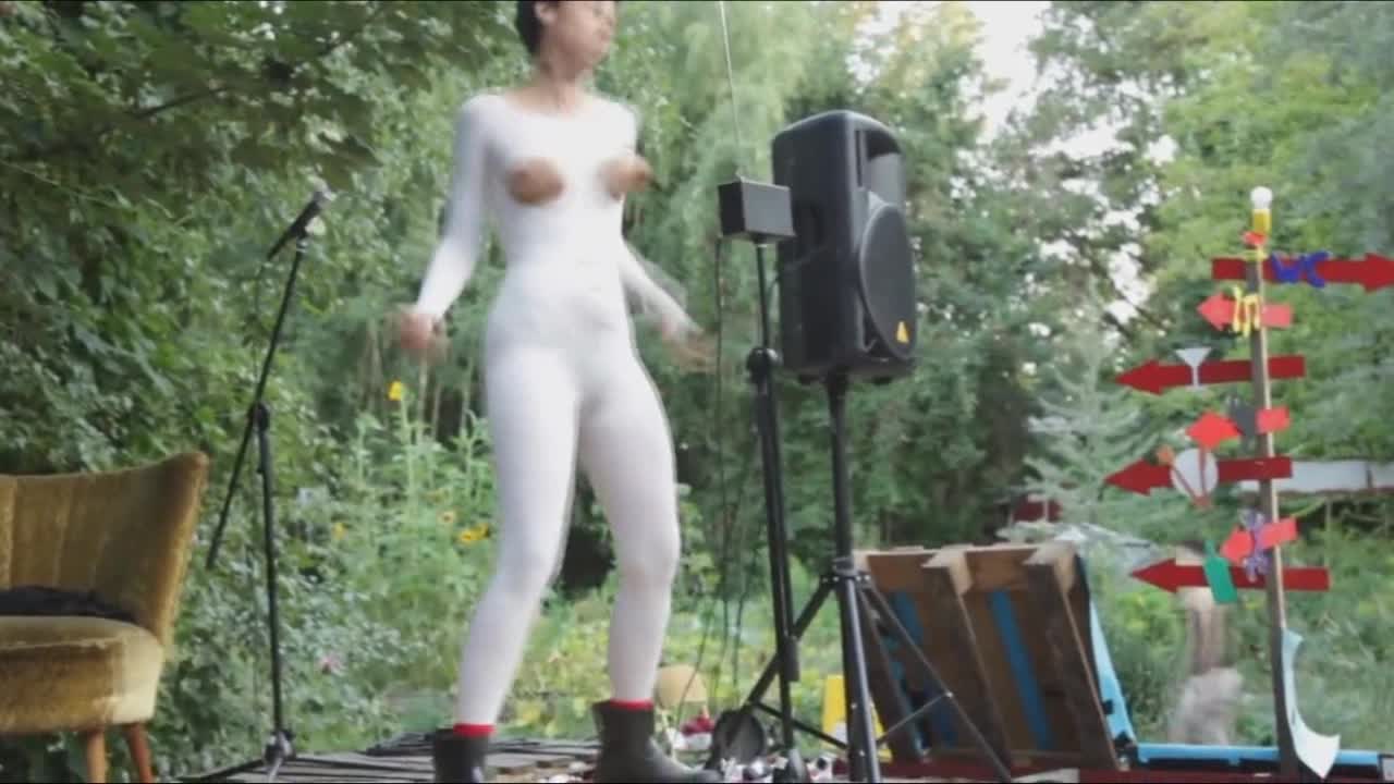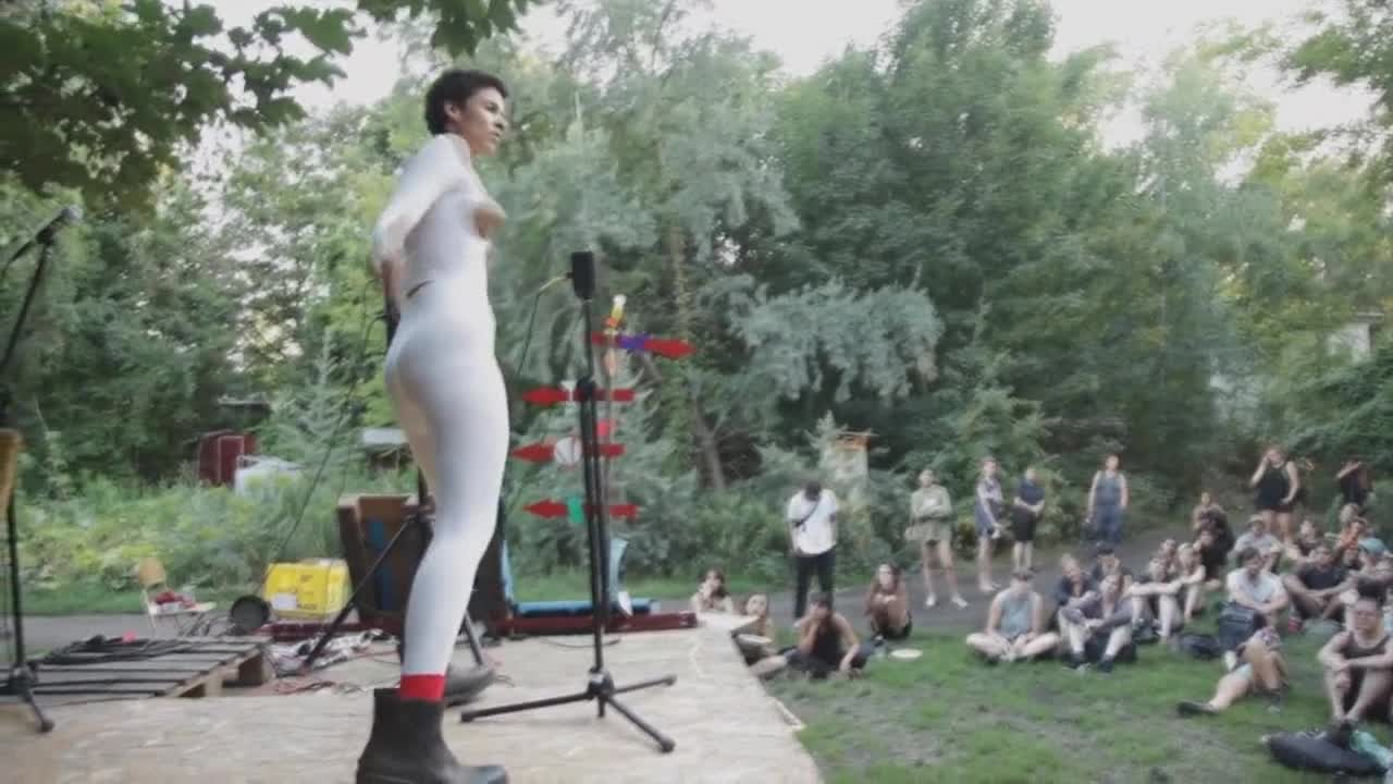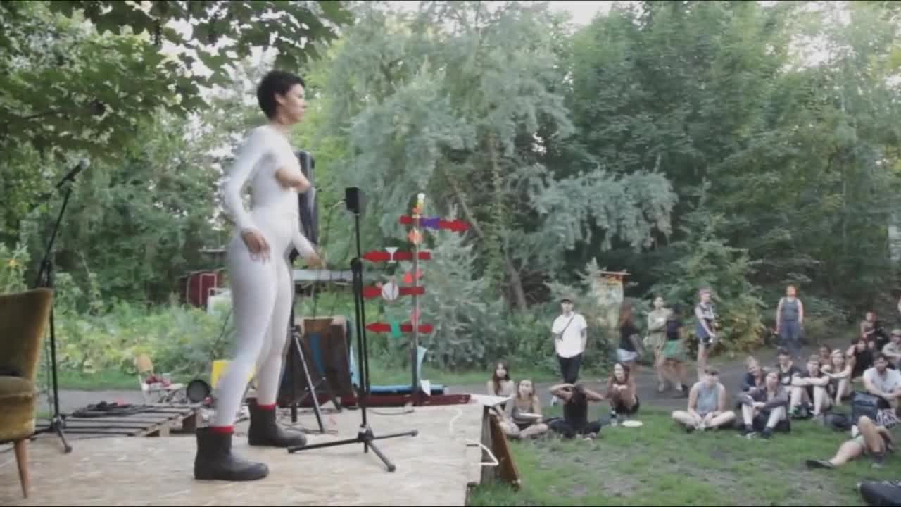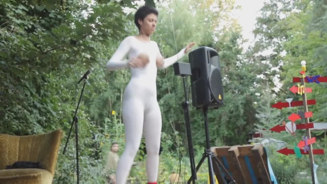 Темнокожая девушка играет на музыкальном инструменте «терменвокс» с помощью своих сисек перед большой аудиторией в парке.
