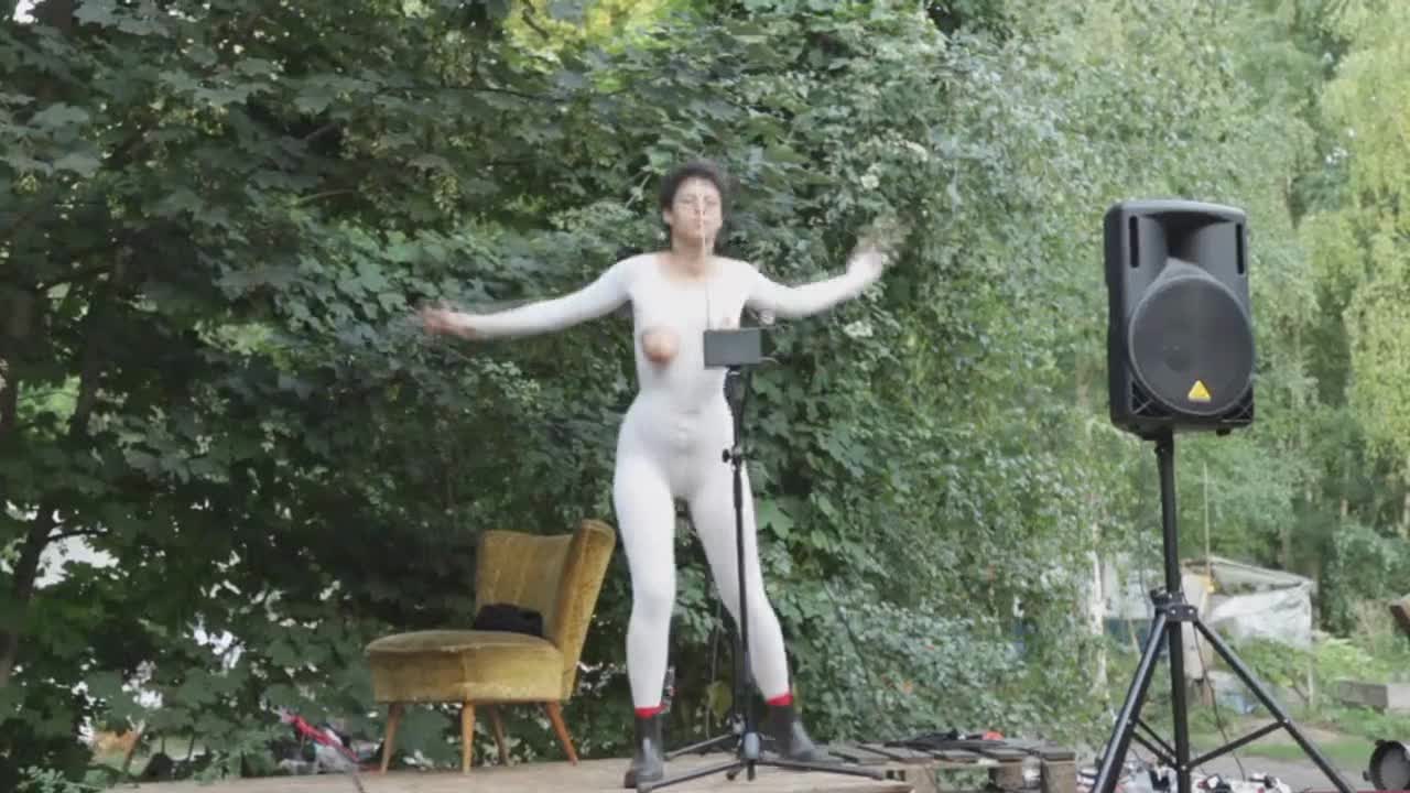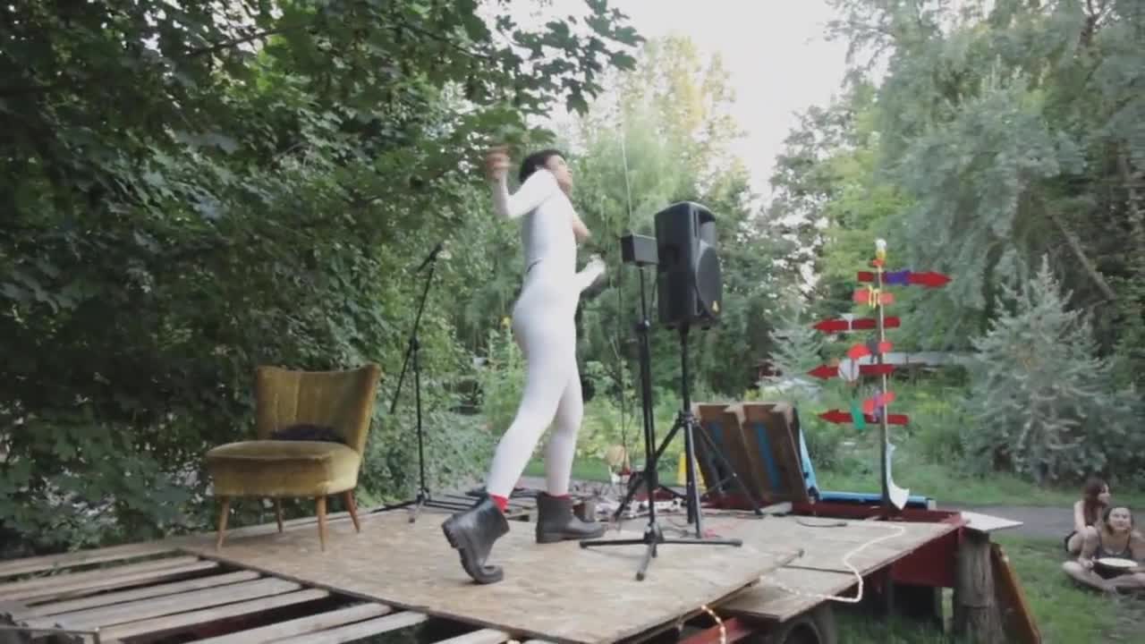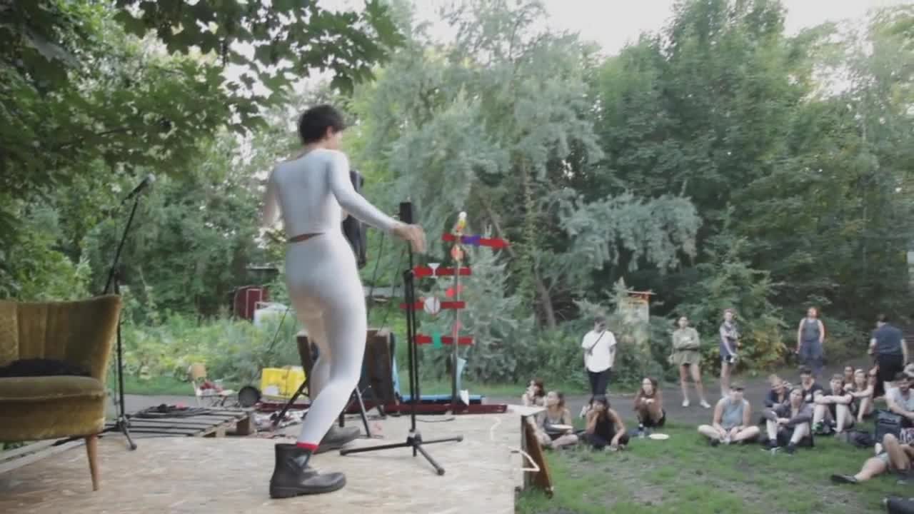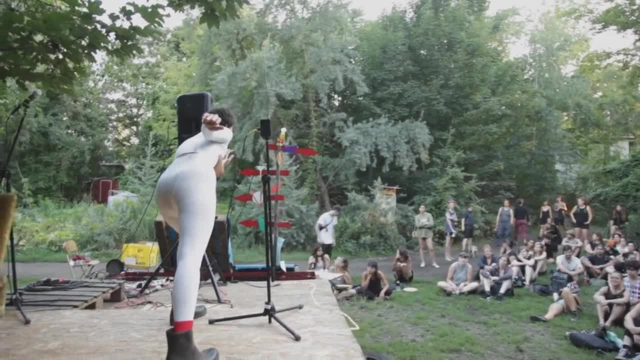 Темнокожая девушка играет на музыкальном инструменте «терменвокс» с помощью своих сисек перед большой аудиторией в парке.