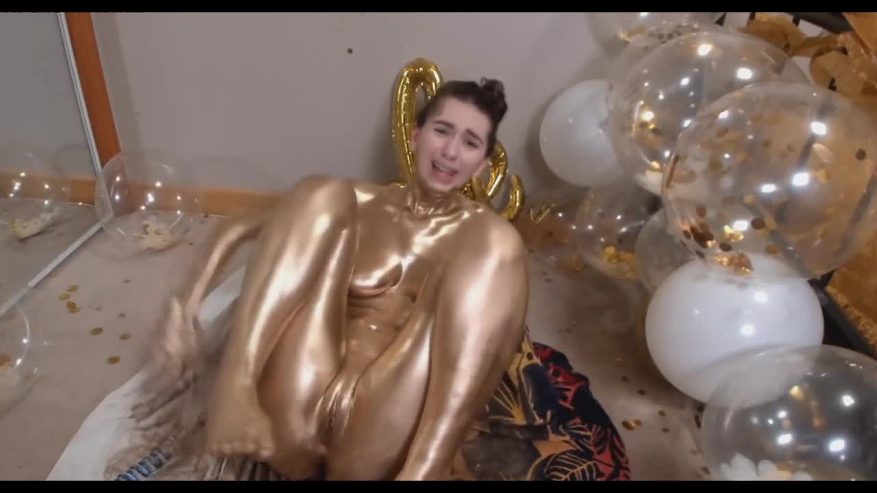 Молодая девушка, покрытая золотой краской по всему своему голому телу, исполняет желания зрителей перед веб-камеру и мастурбирует стеклянным дилдо.