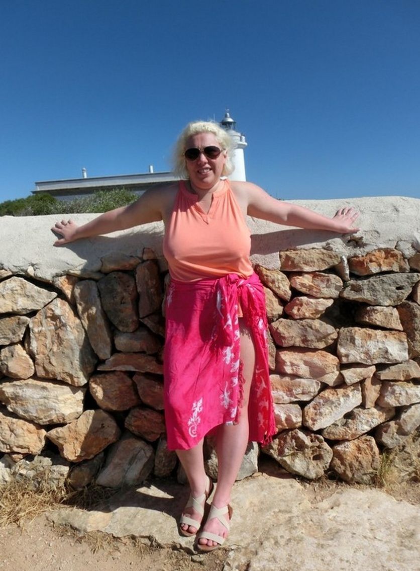 Пухлая женщина раздевается во время посещения испанского туристического объекта