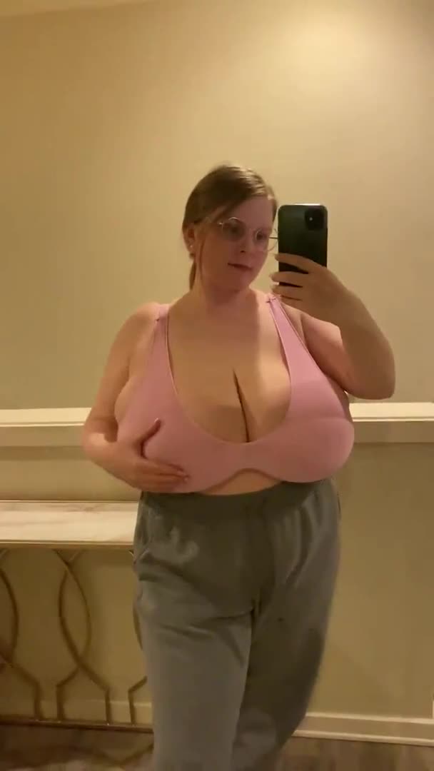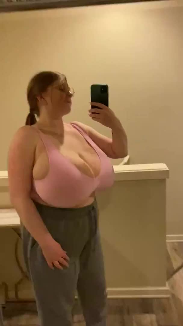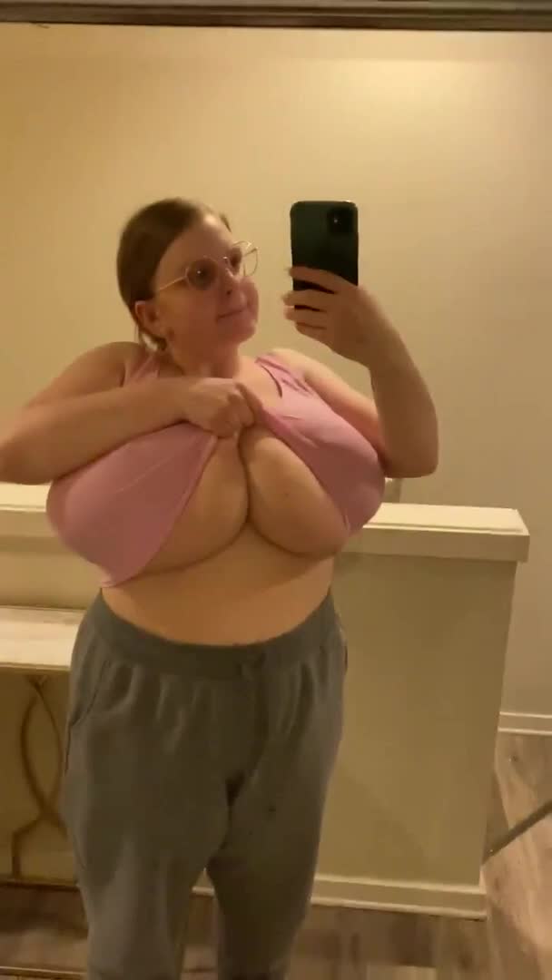 Молодая потрясла сиськами, стоя перед зеркалом.