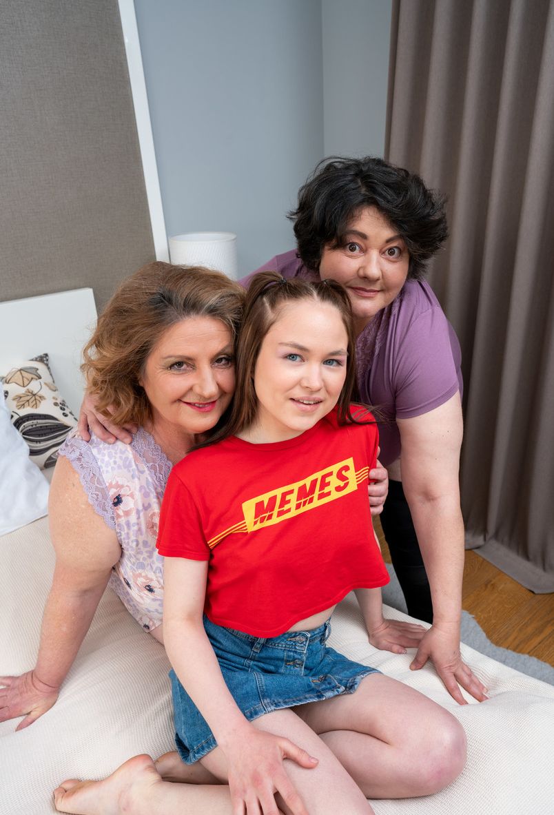 Крошечная молодая девушка занимается лесбийским тройничком с толстыми пожилыми женщинами