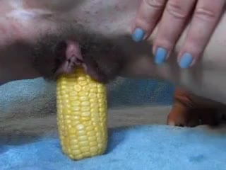 Худая женщина в возрасте присела своей мохнатой писей сверху на кукурузу!