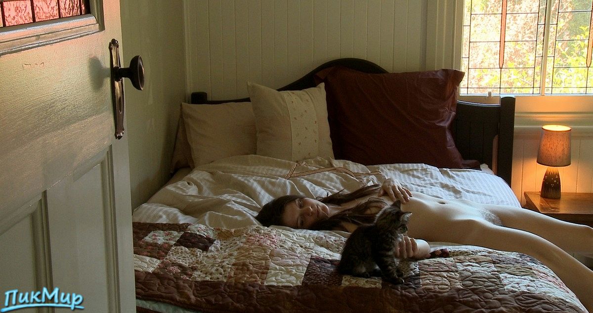 Чувак снимает свою голую подружку, играющую с маленьким котенком и мастурбирующую на кровати.