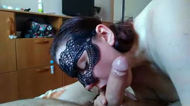 Голая девушка в маске отсосала хороших размеров член, высосав из него все до капельки