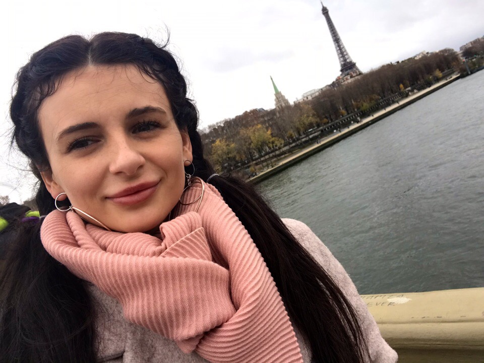 Под зонтом в дождевике, классное фото. Да и пирожных, ей можно много позволить.