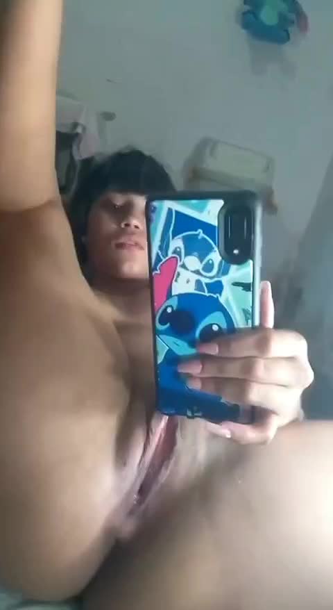 Девка перед зеркалом снимает на телефон ласки своего большого клитора!