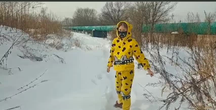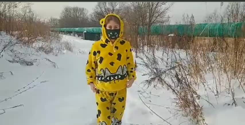 Девушка в смешном костюме и без него играет на заснеженной тропинке.