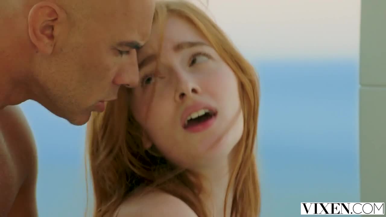Лысый "чёрт" пупыжит мелкогрудую блондинку в киску, а потом кончает ей в ротик в доме над океаном.