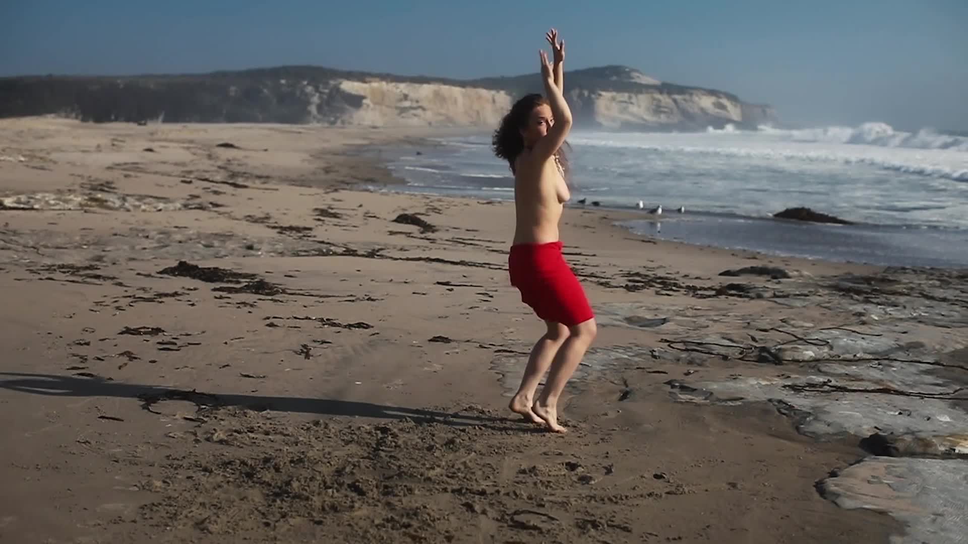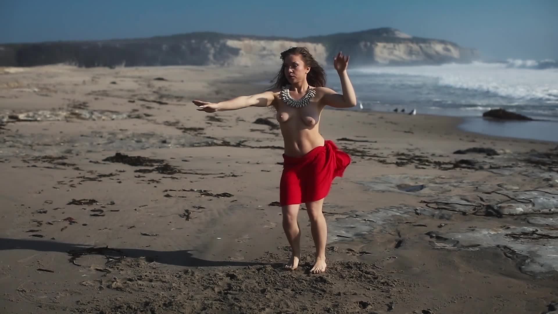 Красивая топлесс девушка с ожерельем из ракушек танцует на берегу моря