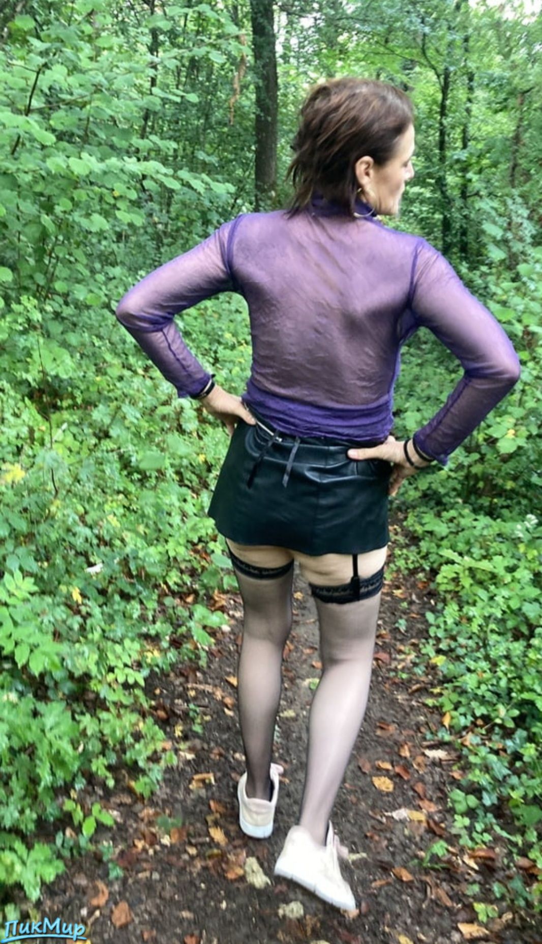 Женщина в возрасте гуляет по лесу в сексуальной одежде