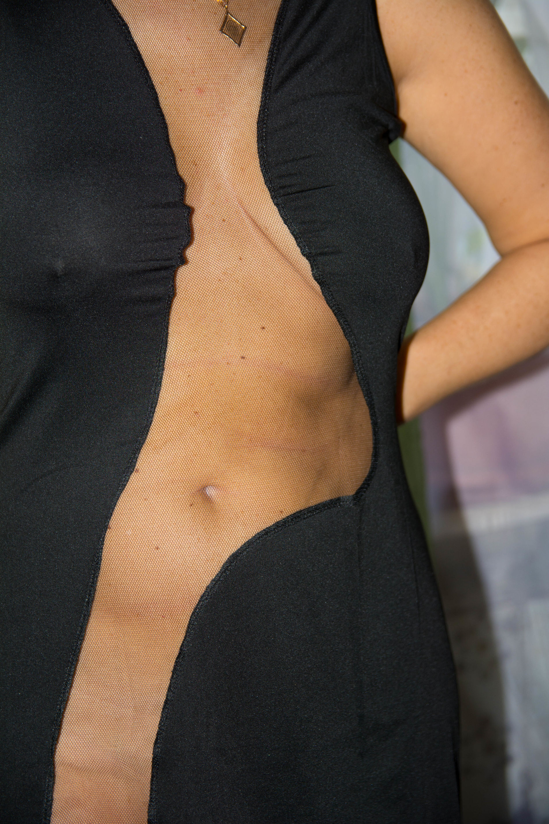 Обычно прозрачные вставки более тёмные в этом типе платья, а тут так откровенно!