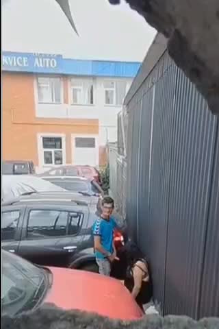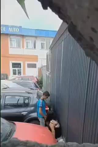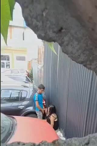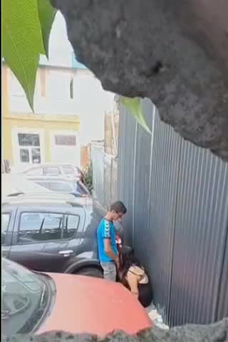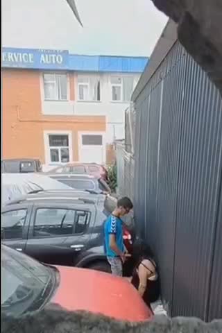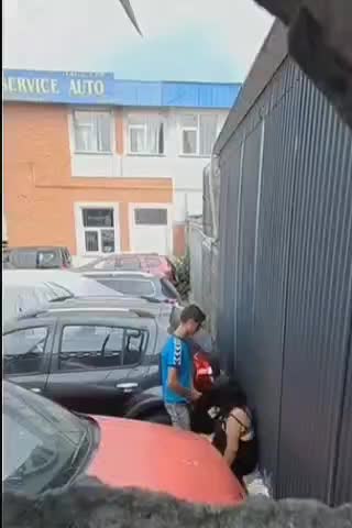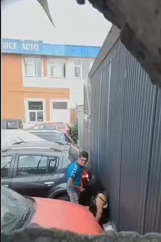 Парочка спряталась между машин и девка сосёт у очкарика.