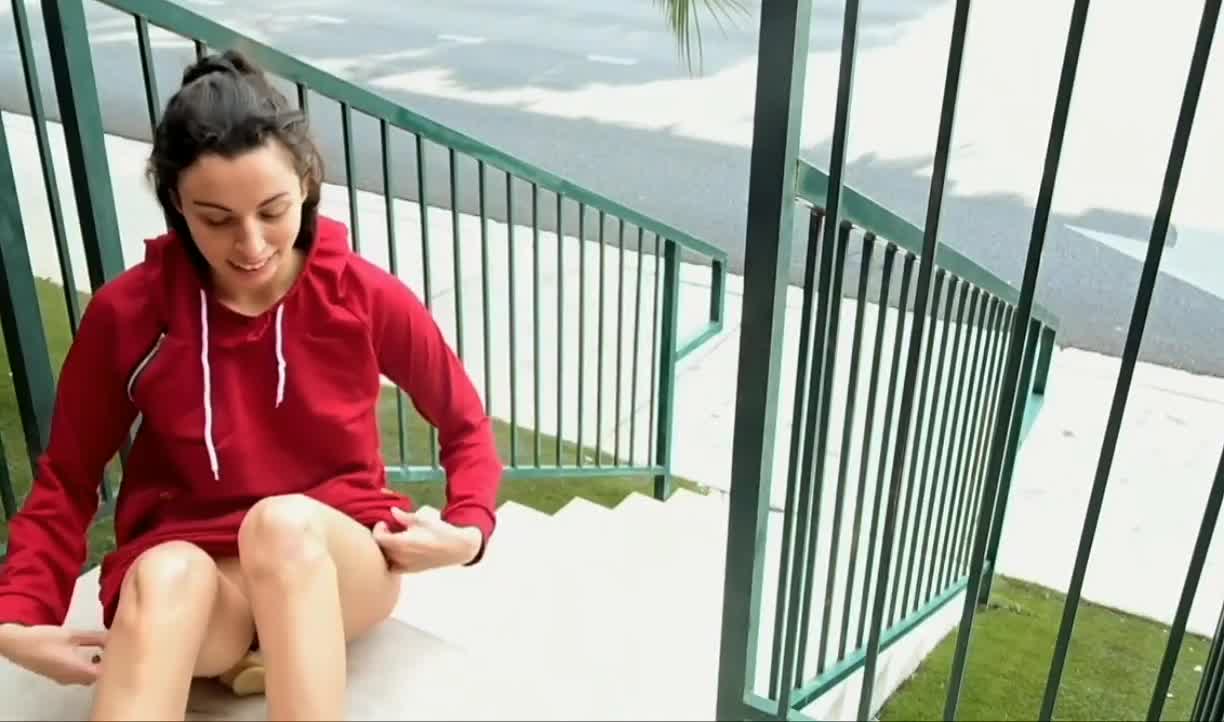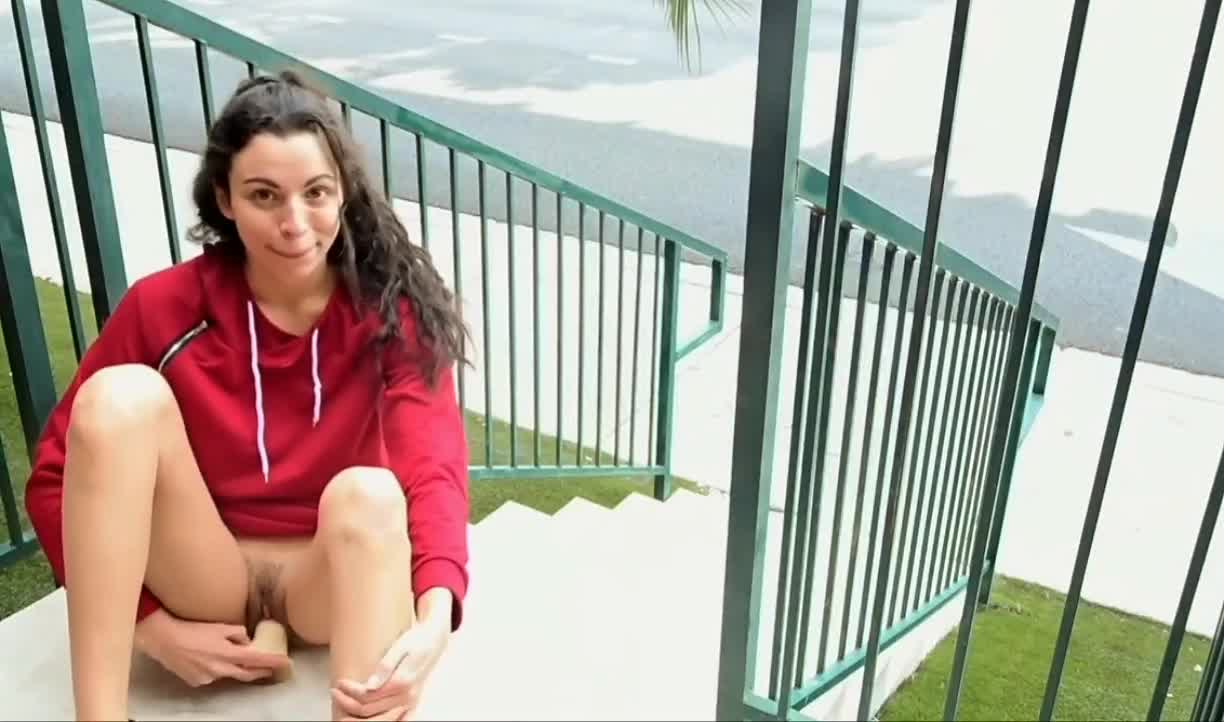 Девка села на уличной лестнице, разделась и подрюкала свою писюху.