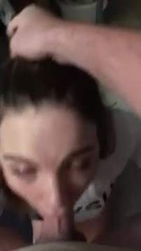 Держит за волосы и натягивает ртом на член стоящую на коленях сучку в одной футболке