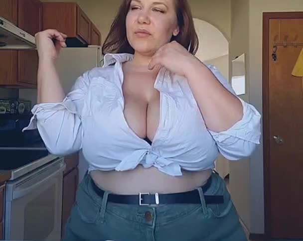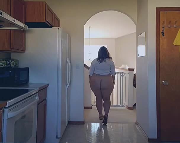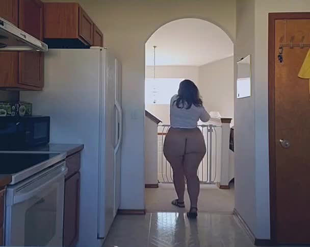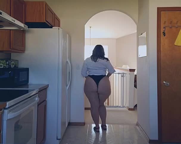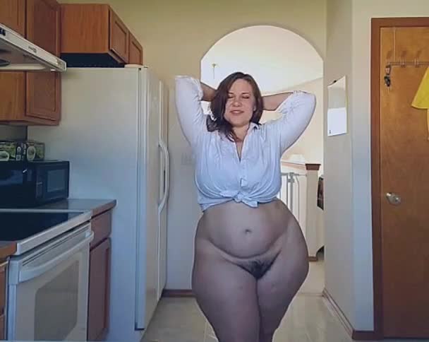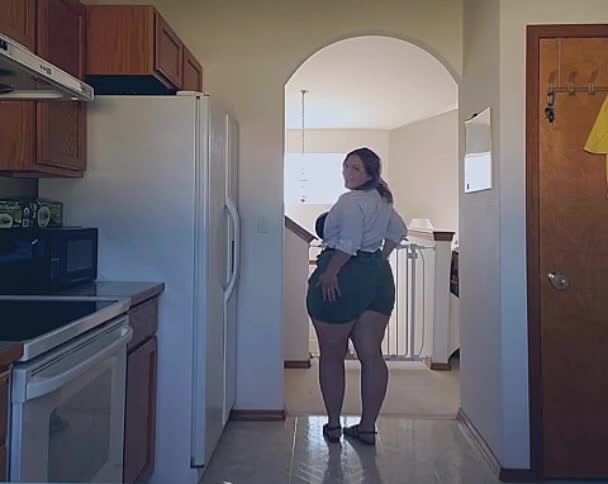 Пухленькая дама показывает свои очень пышные формы на кухне.