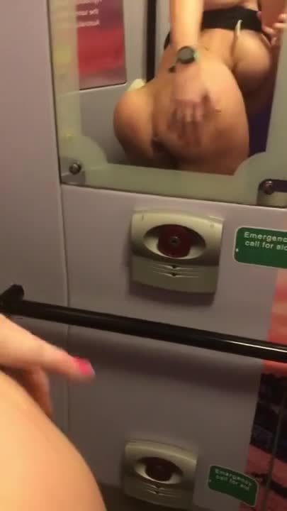 Девушка с силиконовой грудью мастурбирует в общественном туалете