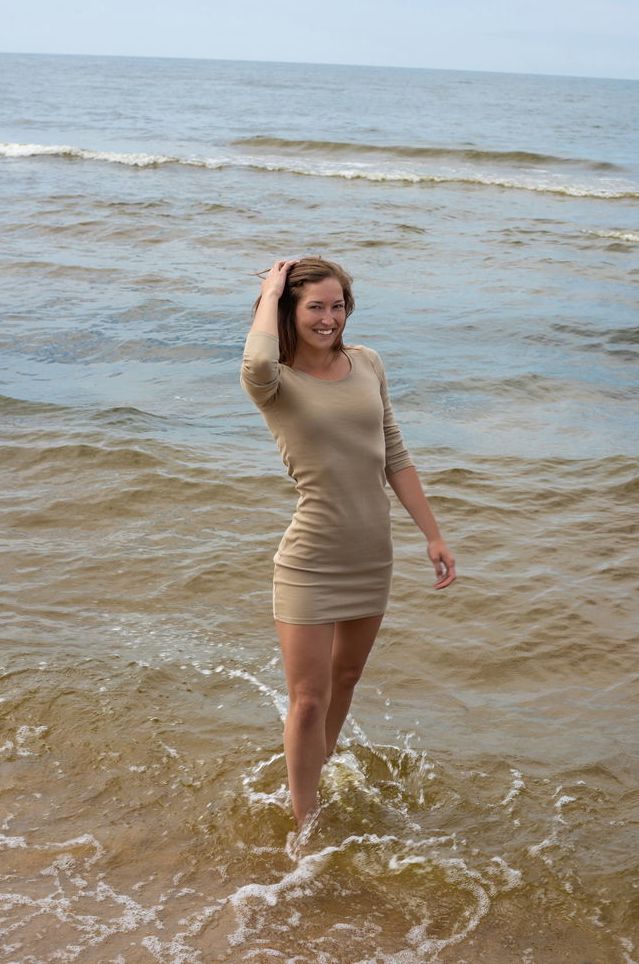Милана развешивает мокрую одежду, чтобы высохнуть, позируя обнаженной на пляже