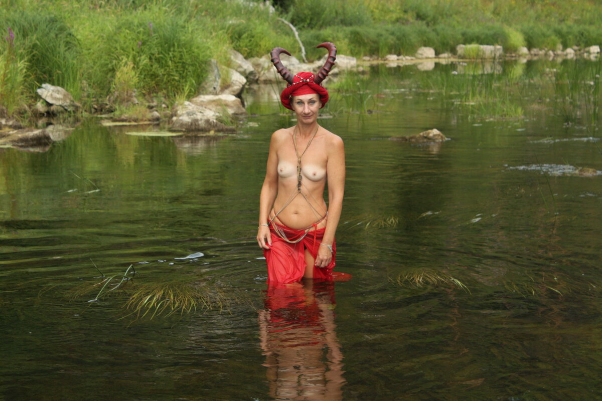 Стройная дама позирует в воде в образе злого духа
