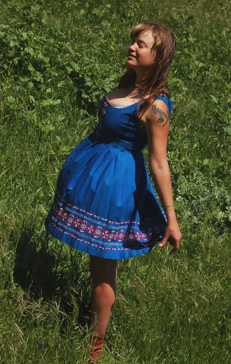 Пухленька Сильвия снимает сарафан и позирует на лугу
