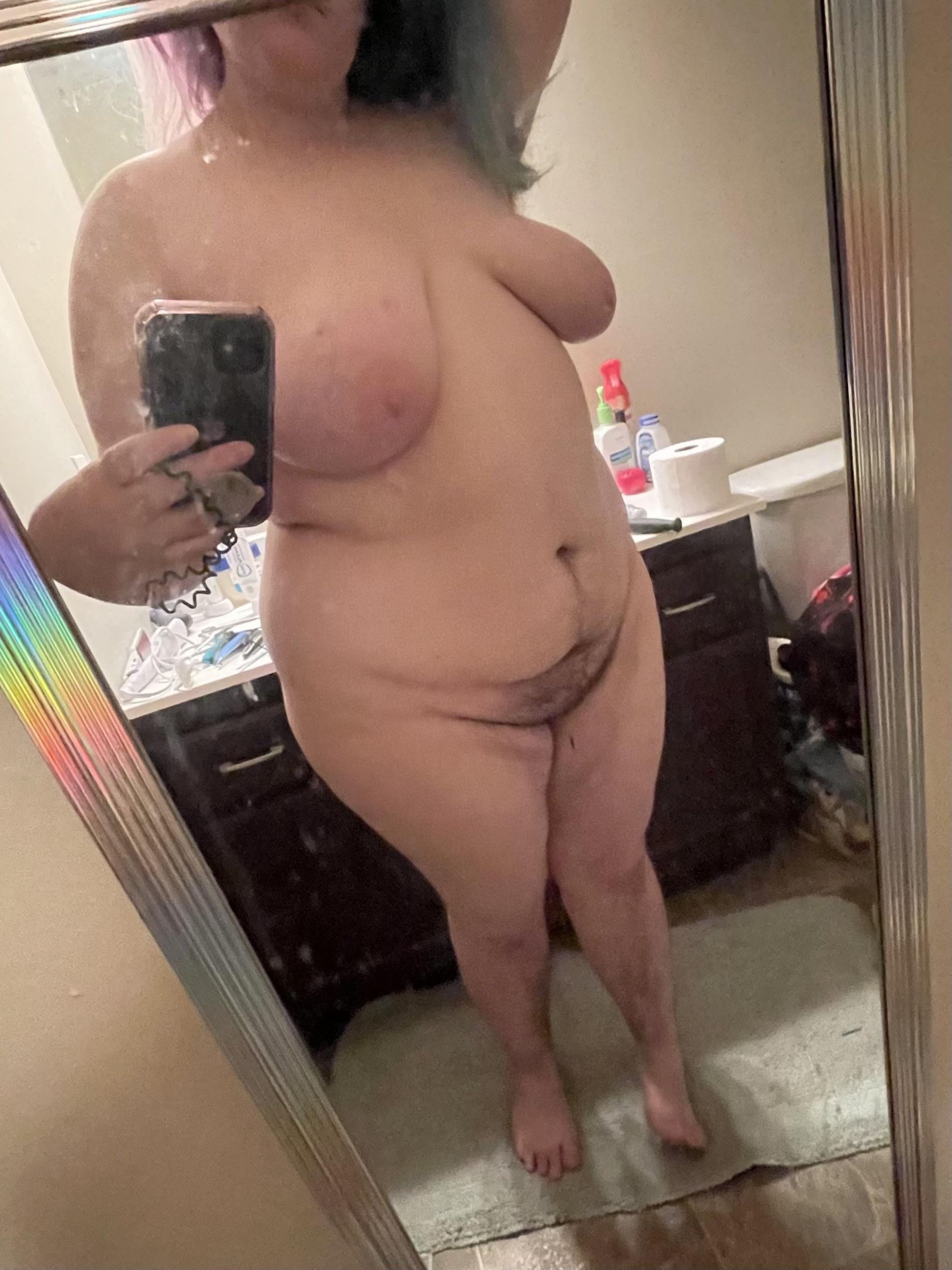 молоденькая милашка синеватыми волосами фоткает себя в ванной комнате на свой телефон в отражении зеркала демонстрируя свою пышную фигуру с волосами на ней.