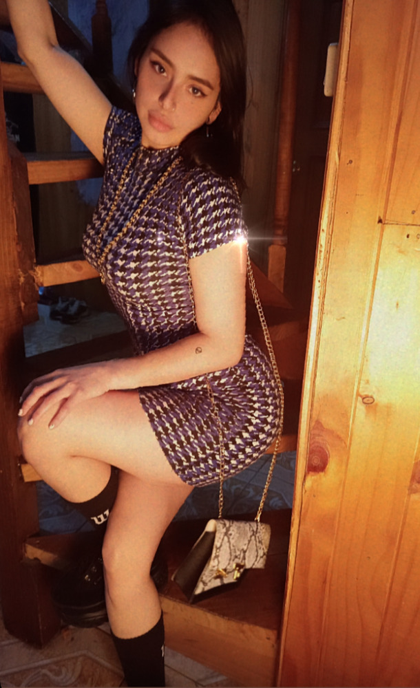В мини платье, вблизи. Ее задница выглядит бомбически.
