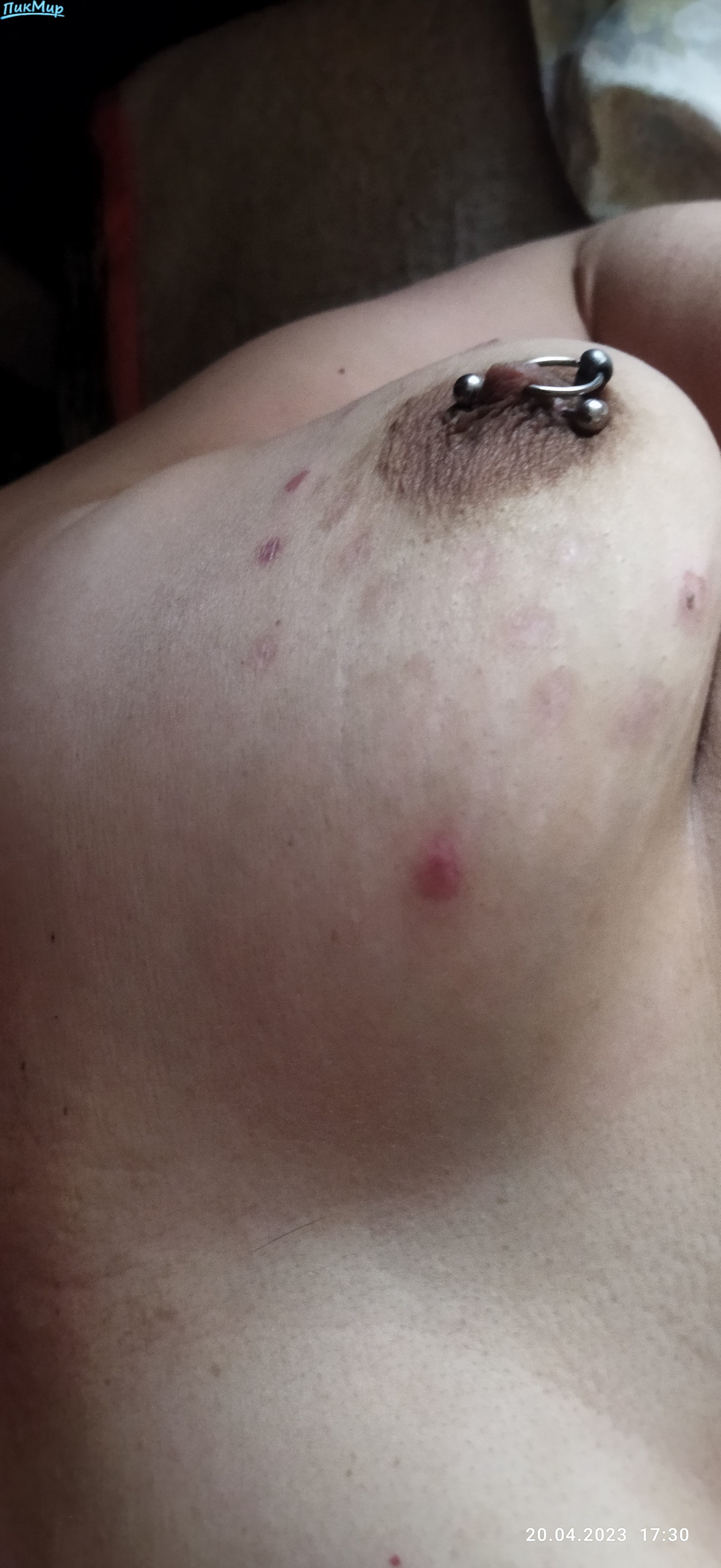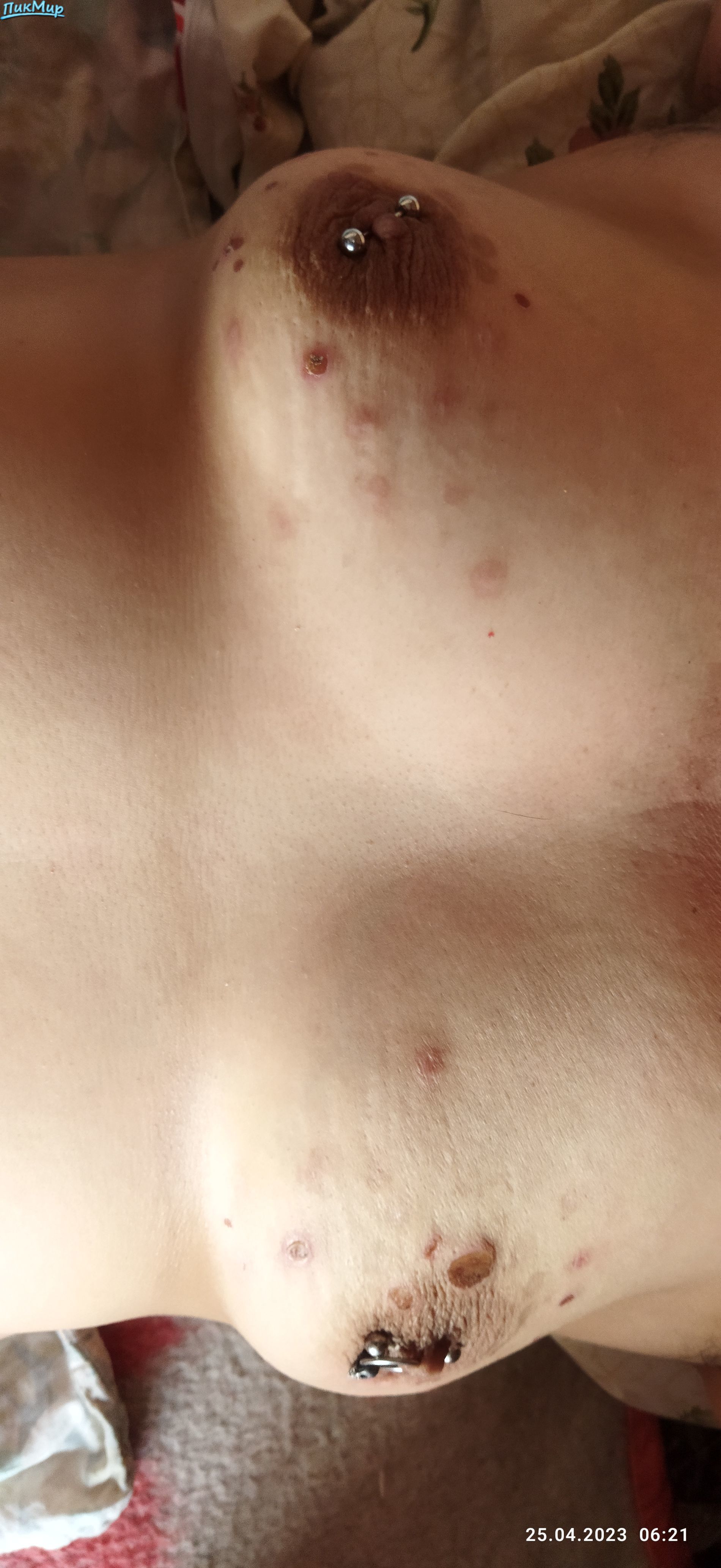 Классные сиськи. Хороший пирсинг. И помучили их...