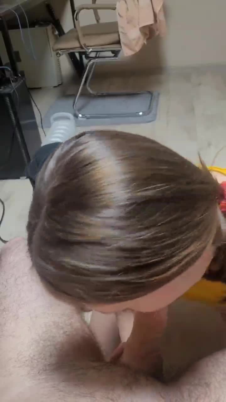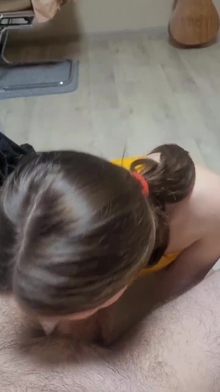 Девчуля занимается миньетом в хорошем настроении. Ей явно нравится это занятие.