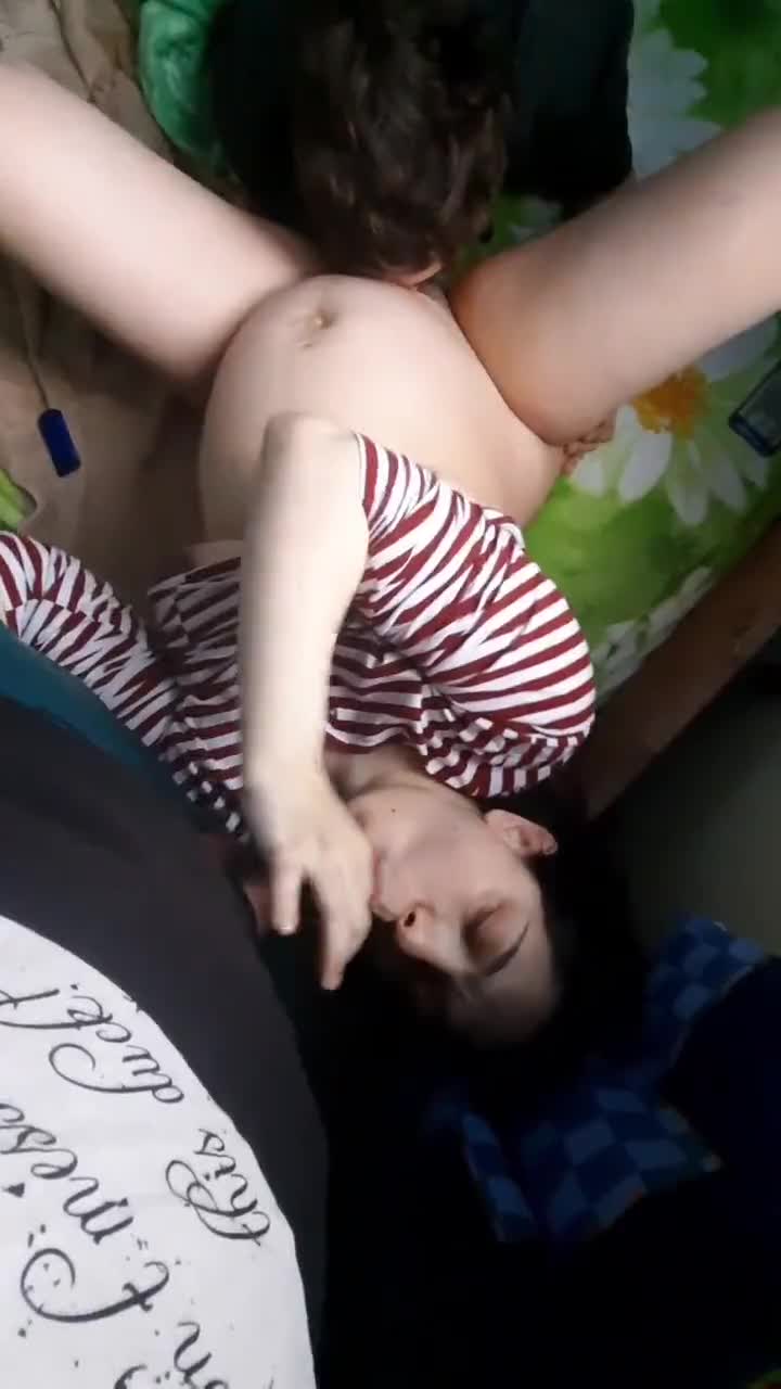 Один лижет киску, второй даёт в рот беременной шлюшке