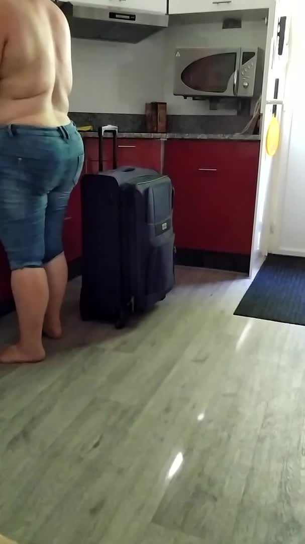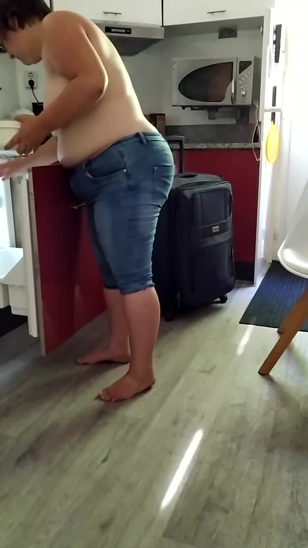 Зрелая женщина с большим животом ходит по дому без лифчика