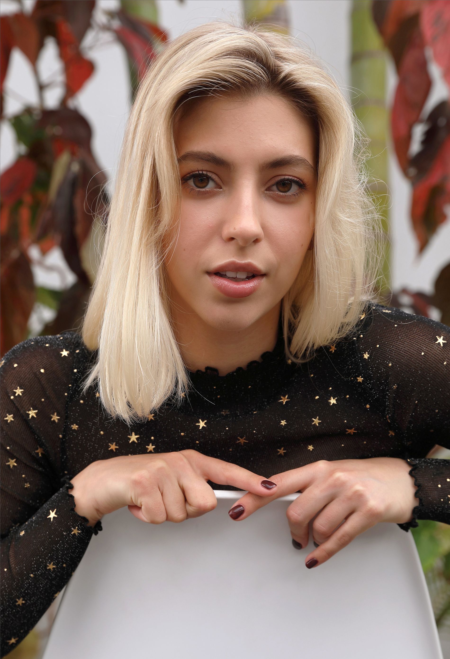 Блондинка позирует сидя рядом с цветами