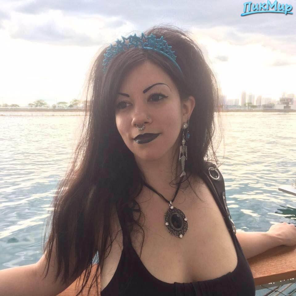 Ядрён-чёрный батон у неё во рту.А яркости, конечно, ей добавляет пирсинг в носу и чёрная помада.