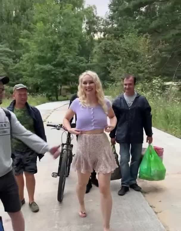 Анна возвращается с пляжа в компании сопровождающих её мужчин.