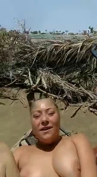 Тётку шпилят на пляже два мужика. Один трахает, другой подрачивает свой болт на её сиськи.