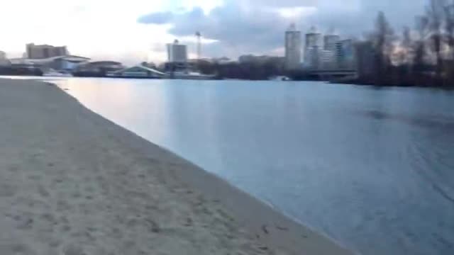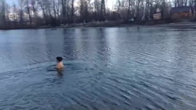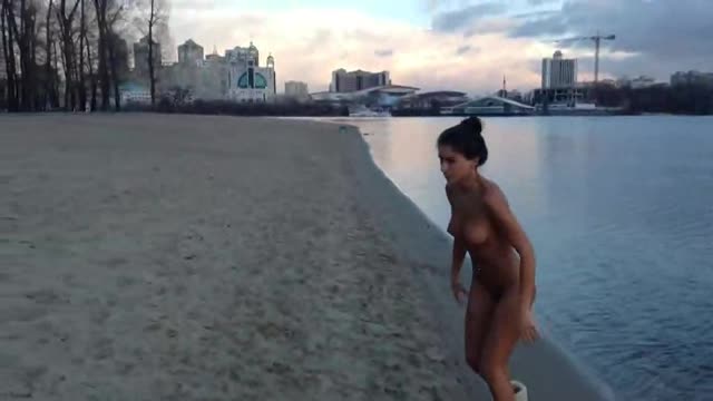 Парочка приехала на берег реки.Телка не стесняясь рыбаков поблизости, разделась догола и окунулась в ледяную воду