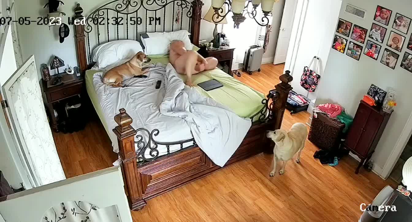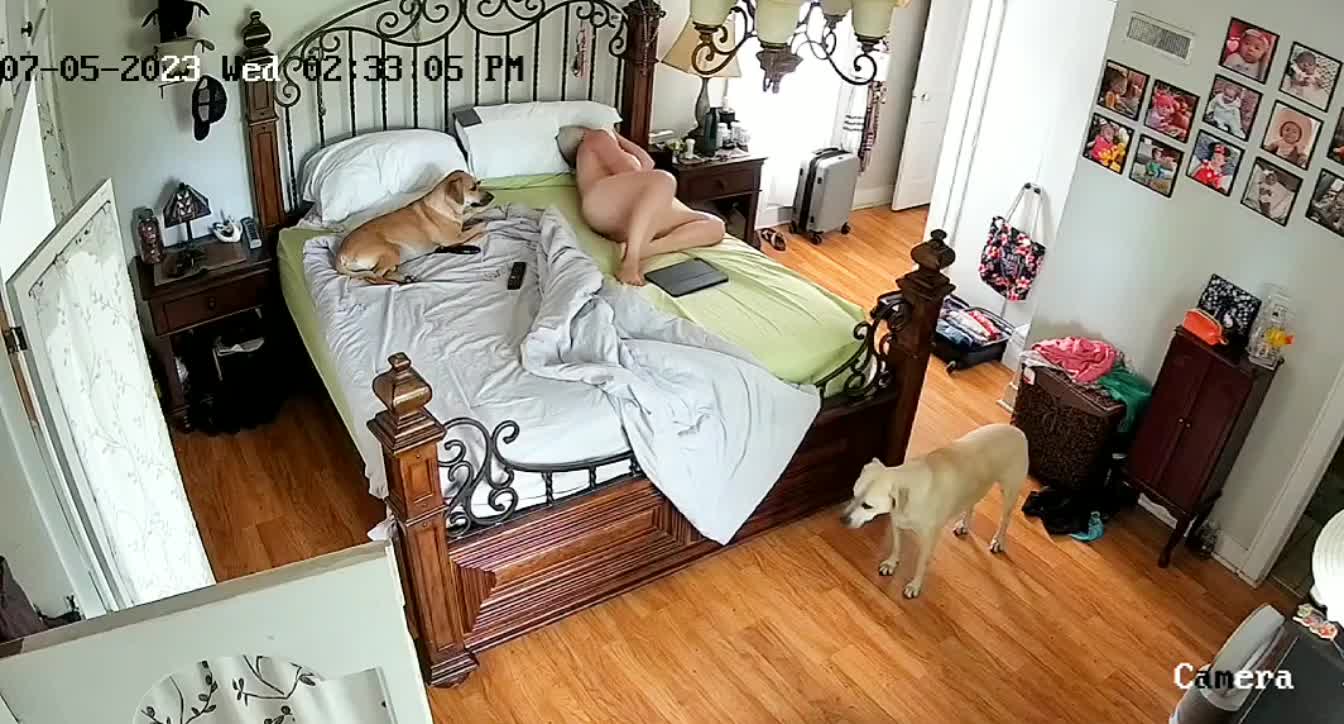 Тётка развлекается с вибратором в постели, а собаки наблюдают.