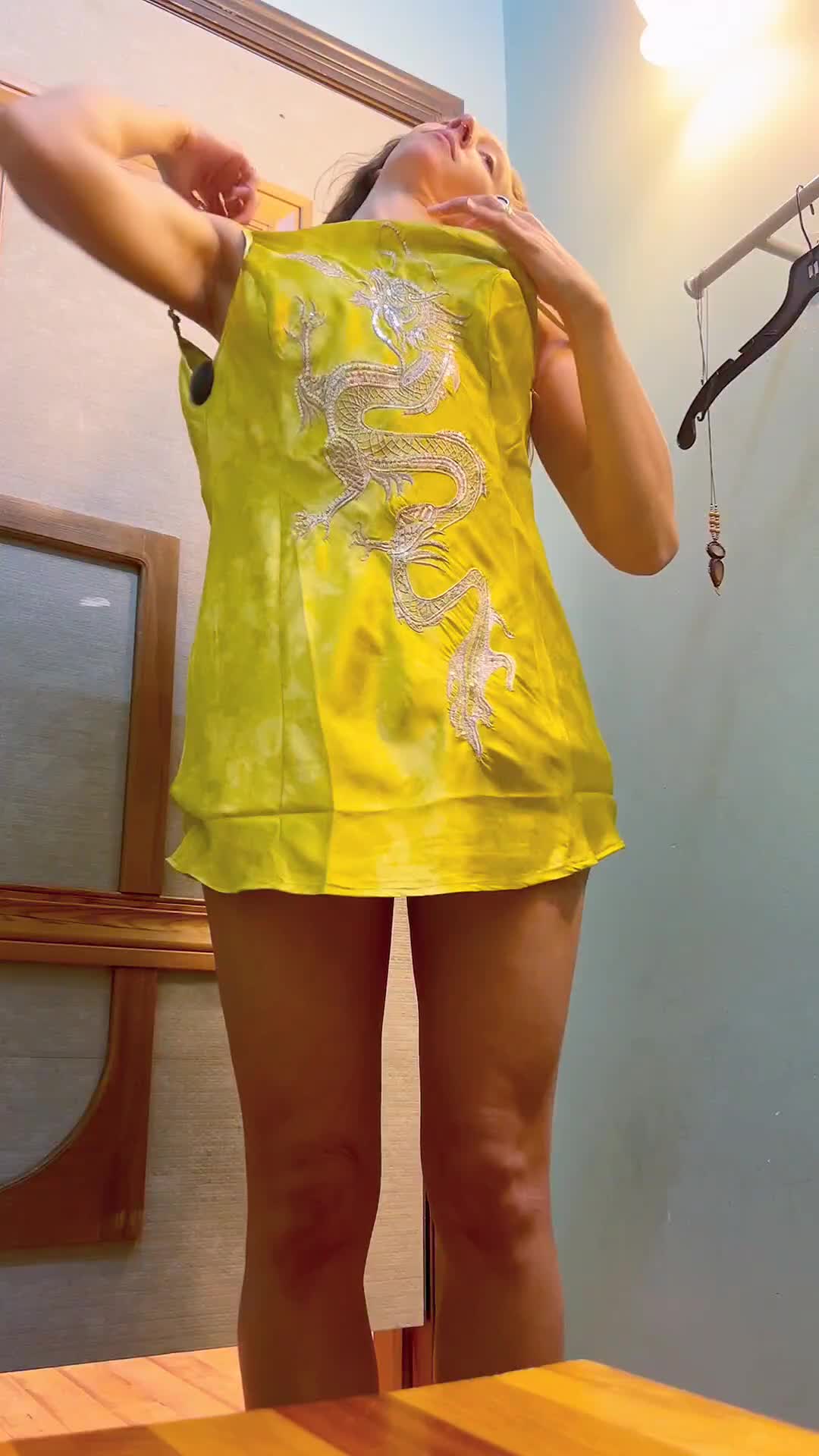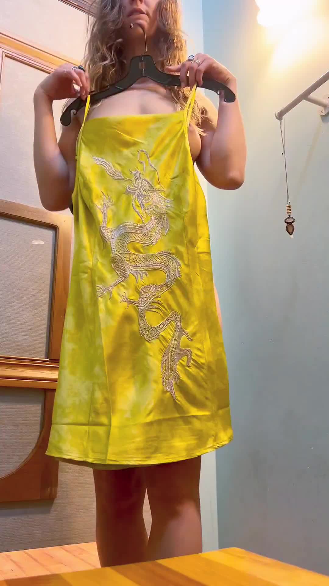 Девка в примерочной магазина примеряет платье и заодно показывает свое прекрасное, молодое тело.