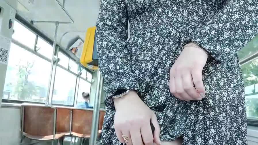 Девушка едет на общественном транспорте и периодически показывает что у неё под платьем