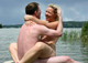 Милая пара целуется, ласкается, смеется и пытается заняться любовью на берегу озера.