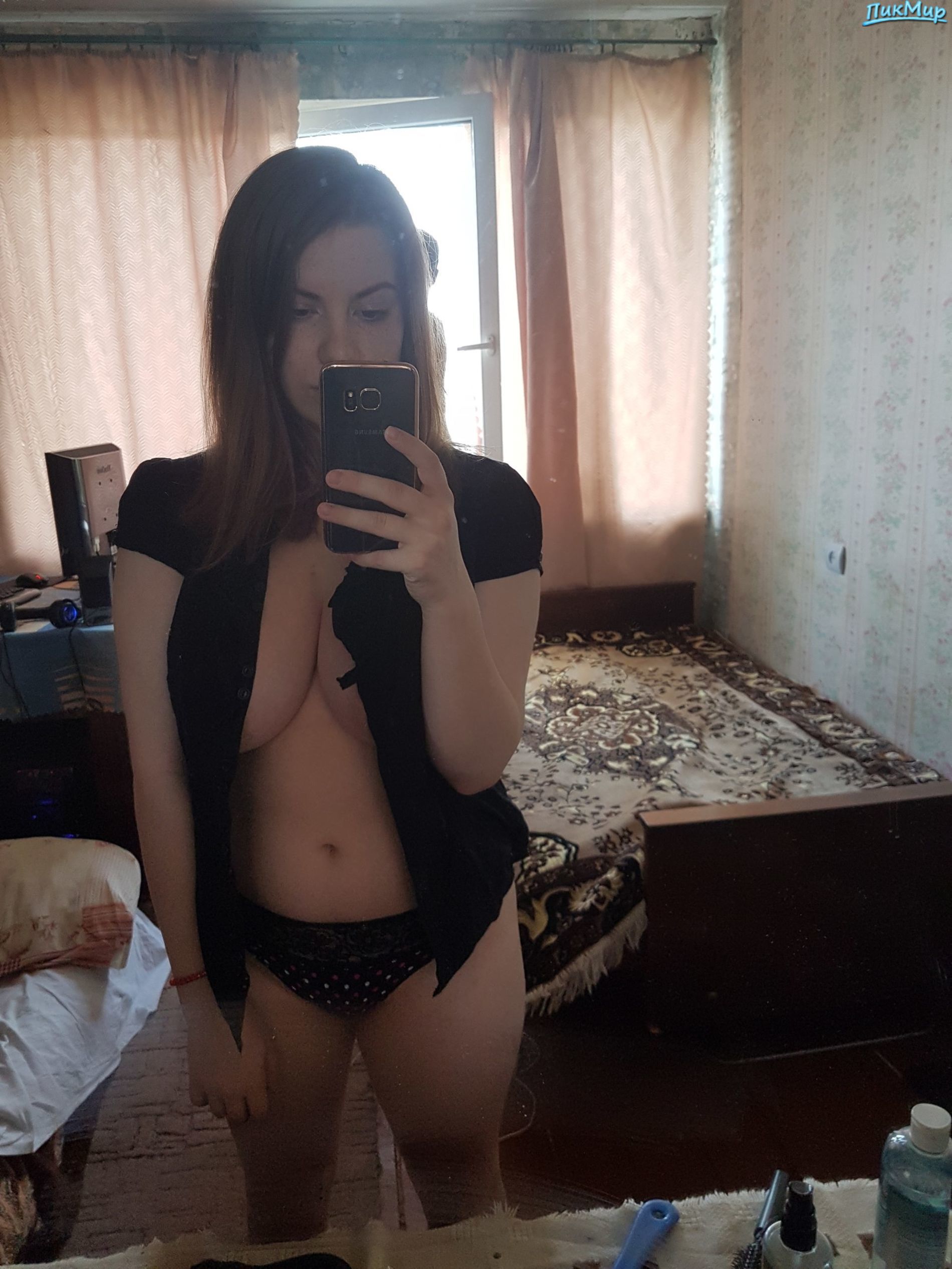 Молодая девушка с большой грудью делает селфи перед зеркалом