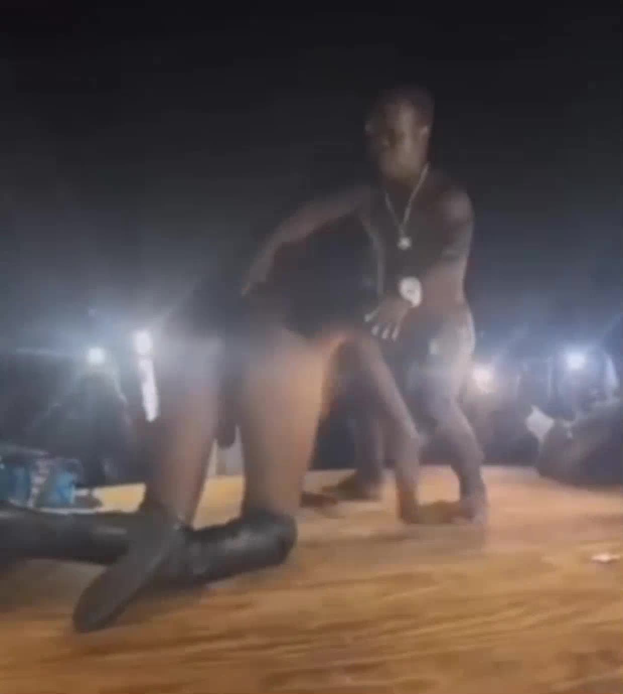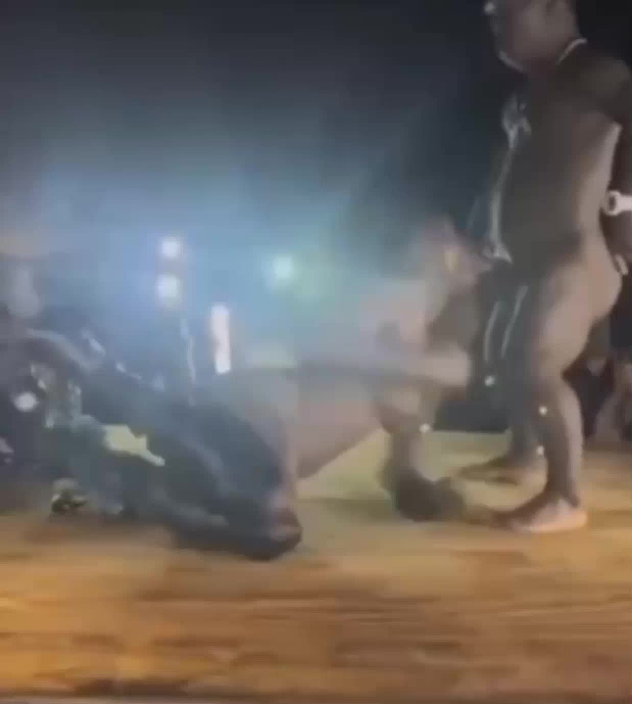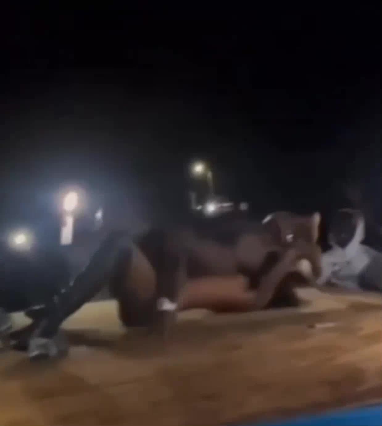 Девушка пританцовывая старается не вынимать изо рта большой чёрный член мелкого негра.