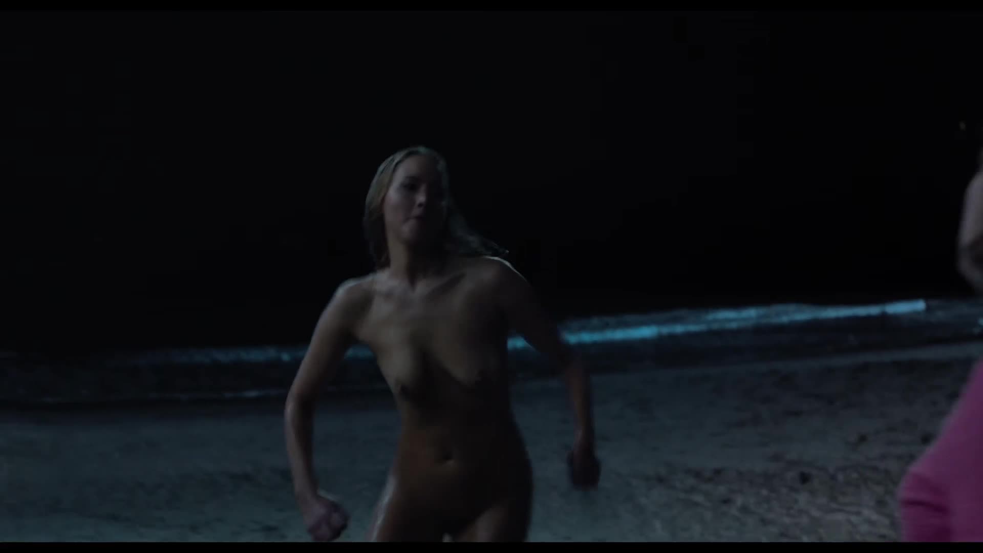 небольшой момент из фильма "Без обид" в котором полностью обнаженная тридцатитрехлетняя актриса Дженнифер Лоуренс выходит из воды и борется с ворами своей одежды, показывая свои сиськи, киску и попку.