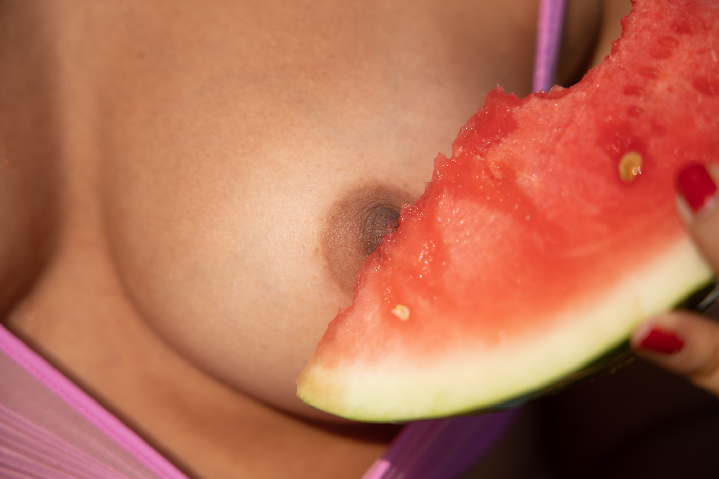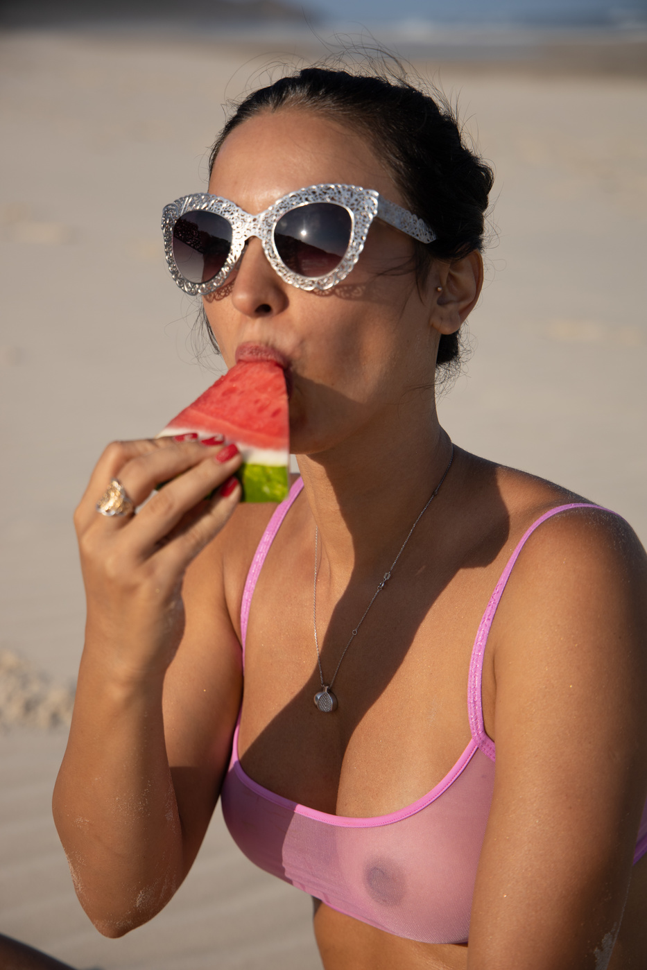 Это благо то, что пляж,пустынный. А то бы ей,арбузика покушать.