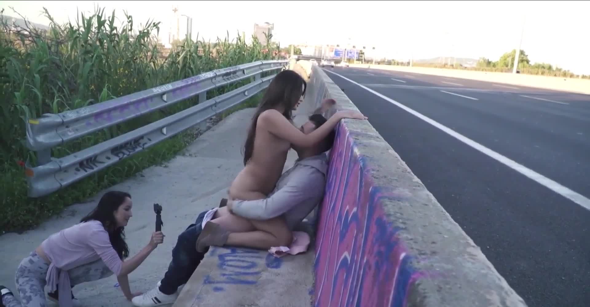 экстремальная парочка страстно трахается на оживленной дороге, не обращая внимания на проезжающих мимо велосипедистов, автобусов, грузовиков и легковых автомобилей, а их подруга помогает им и фотографирует на камеру.
