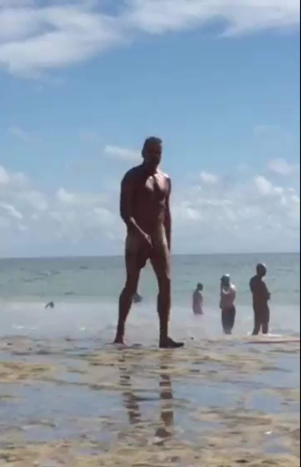 Мужчина с огромным членом, болтающимся между ног, гордо выходит из моря.