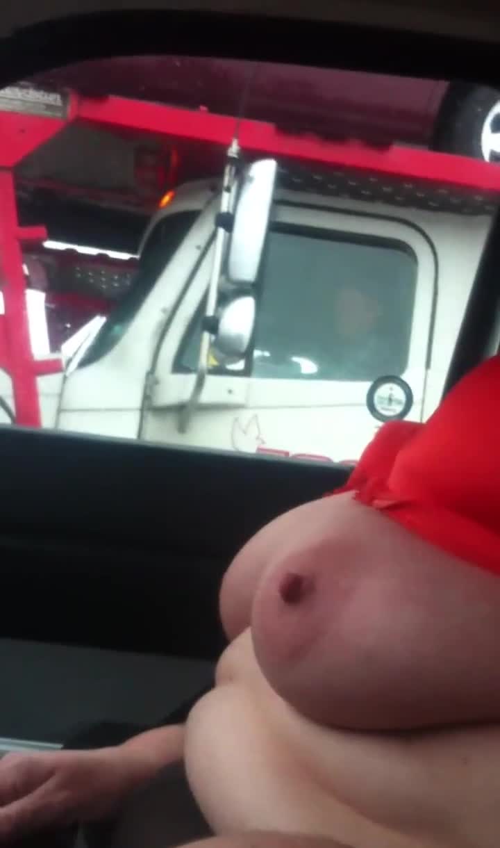 жена показывает свои сиськи водителю грузовика, а ее муж снимает во время вождения.
