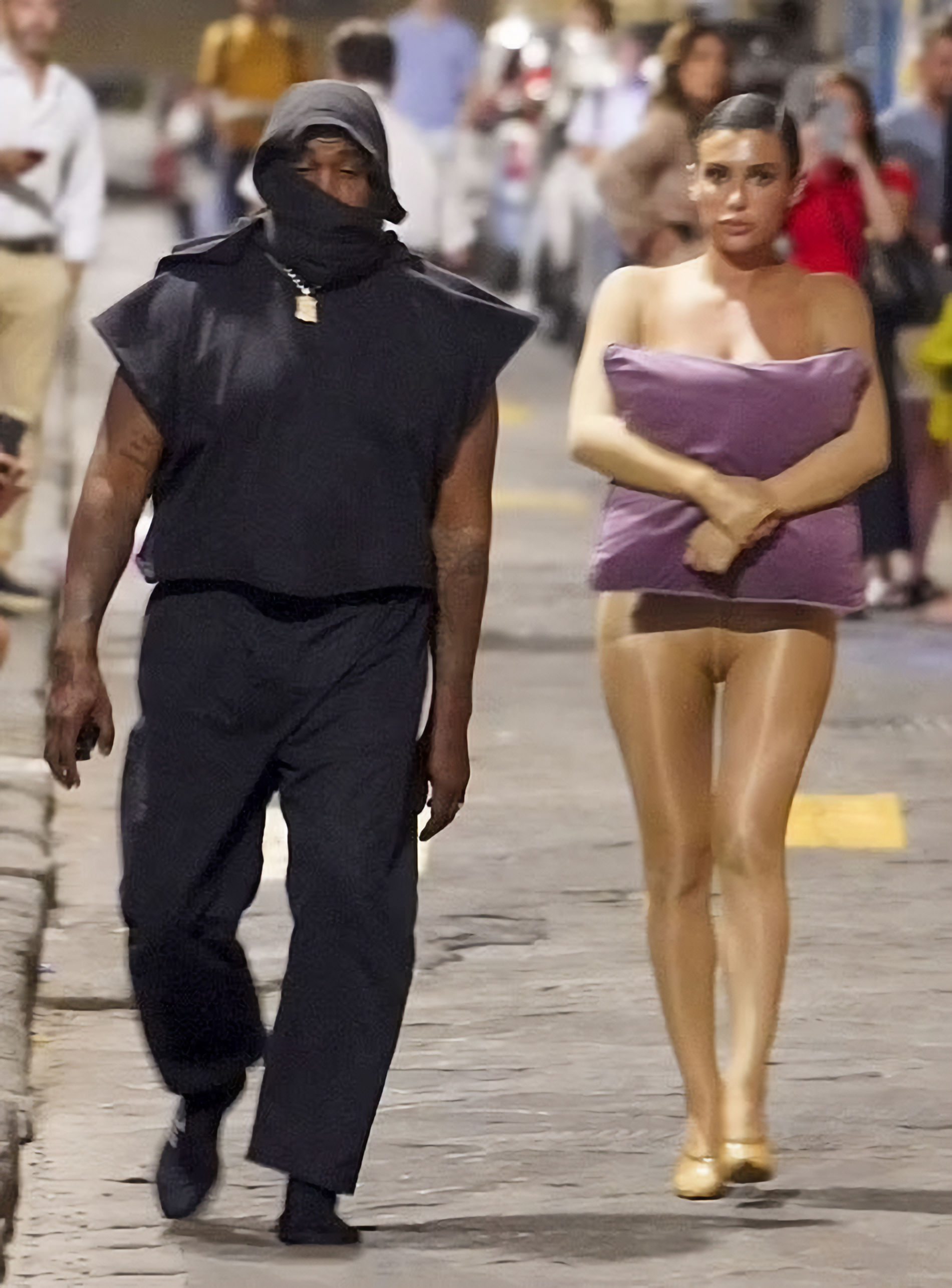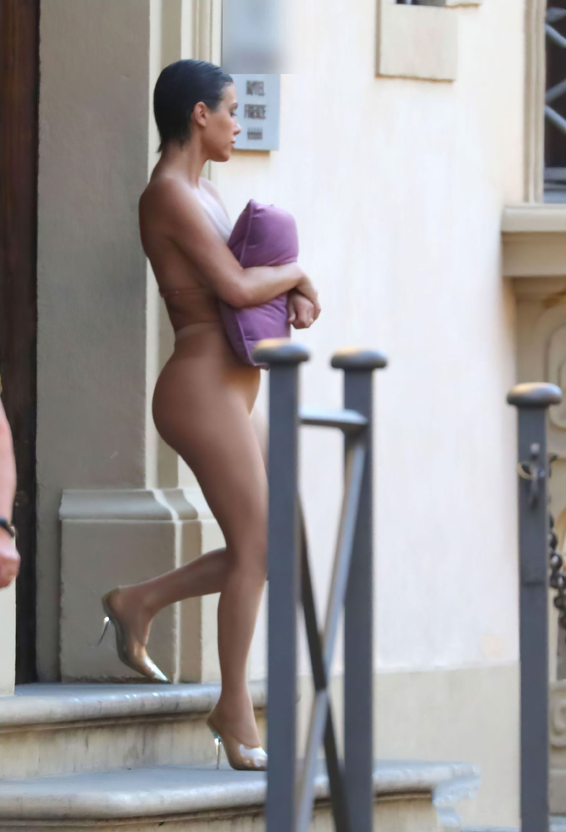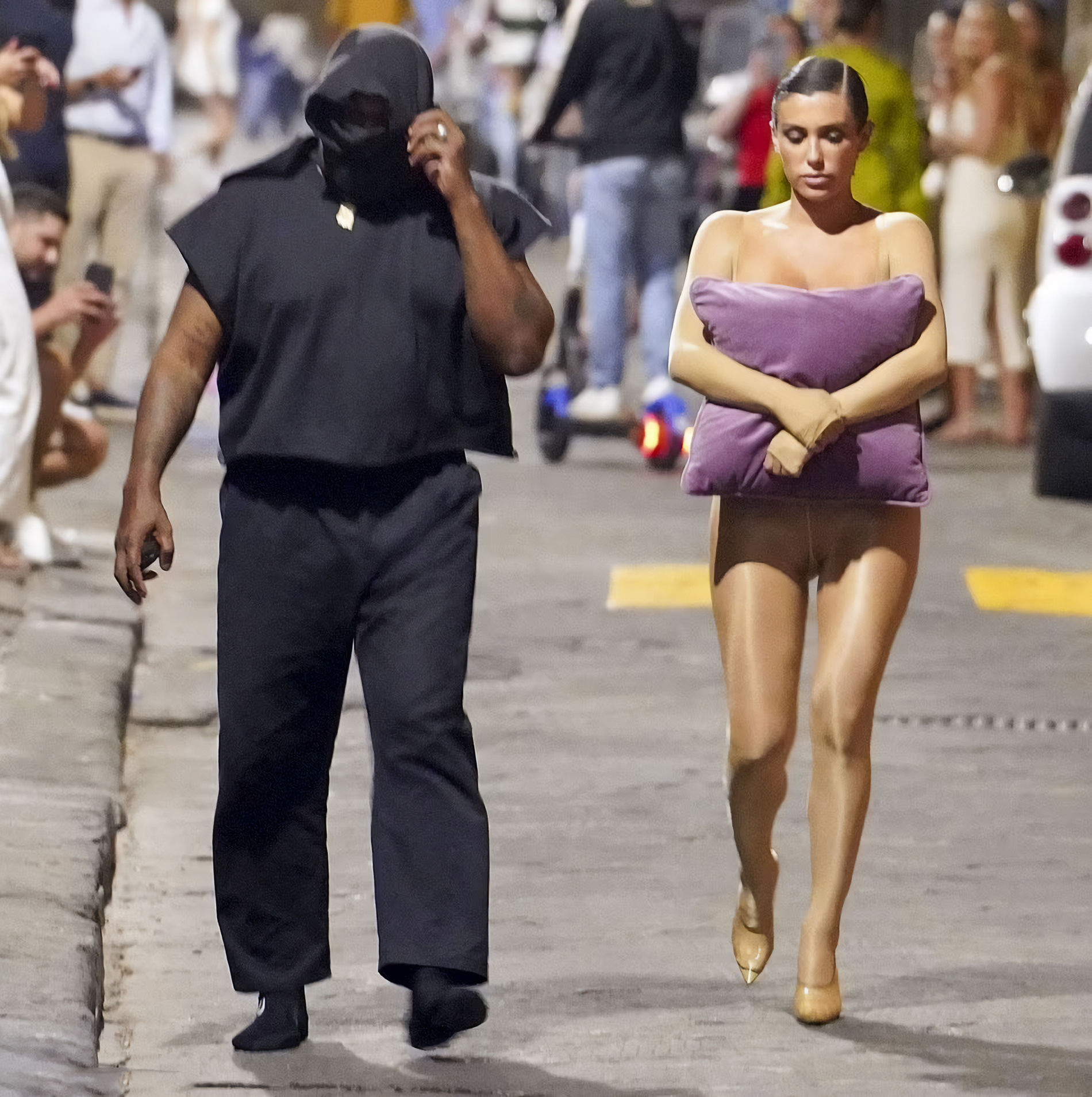 Бьянку заметили в одних колгоках и с подушкой, когда она и ее муж рэпер Канье Уэст выходили из своей гостиницы во Флоренции 6 сентября 2023 года.