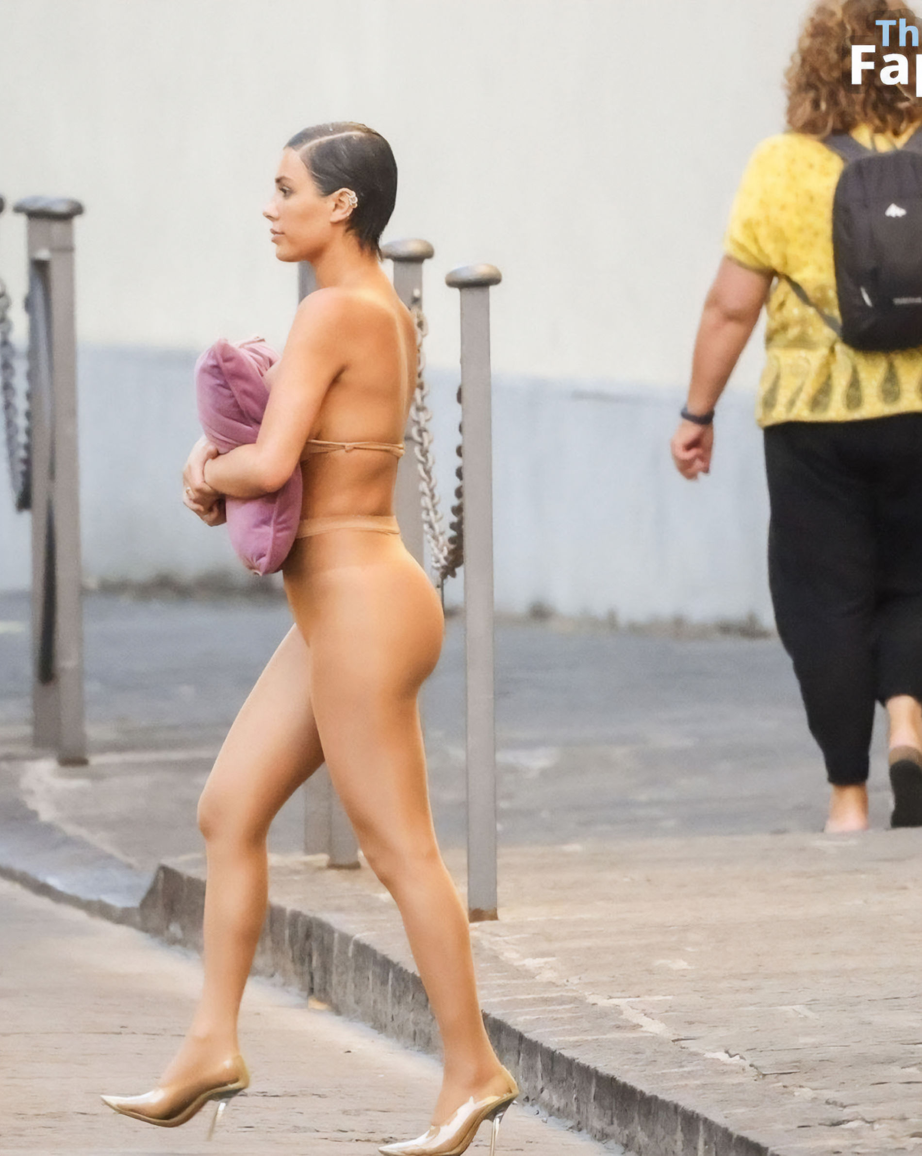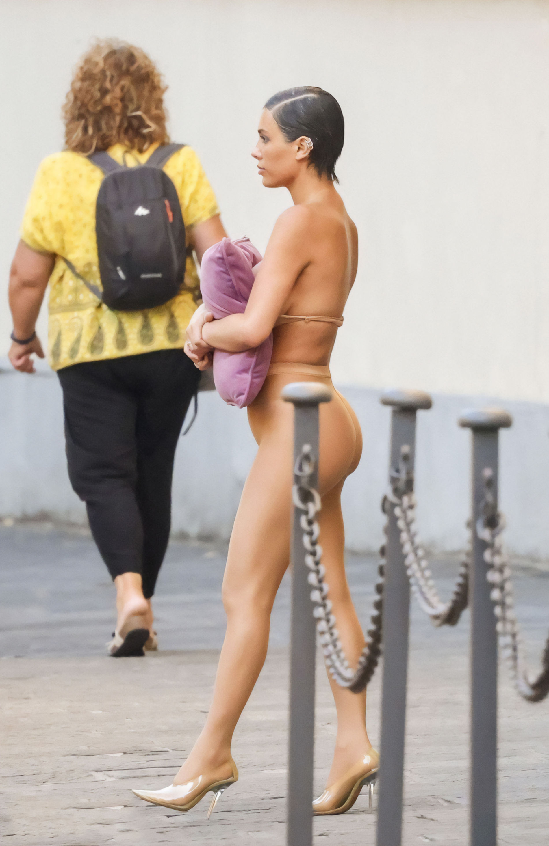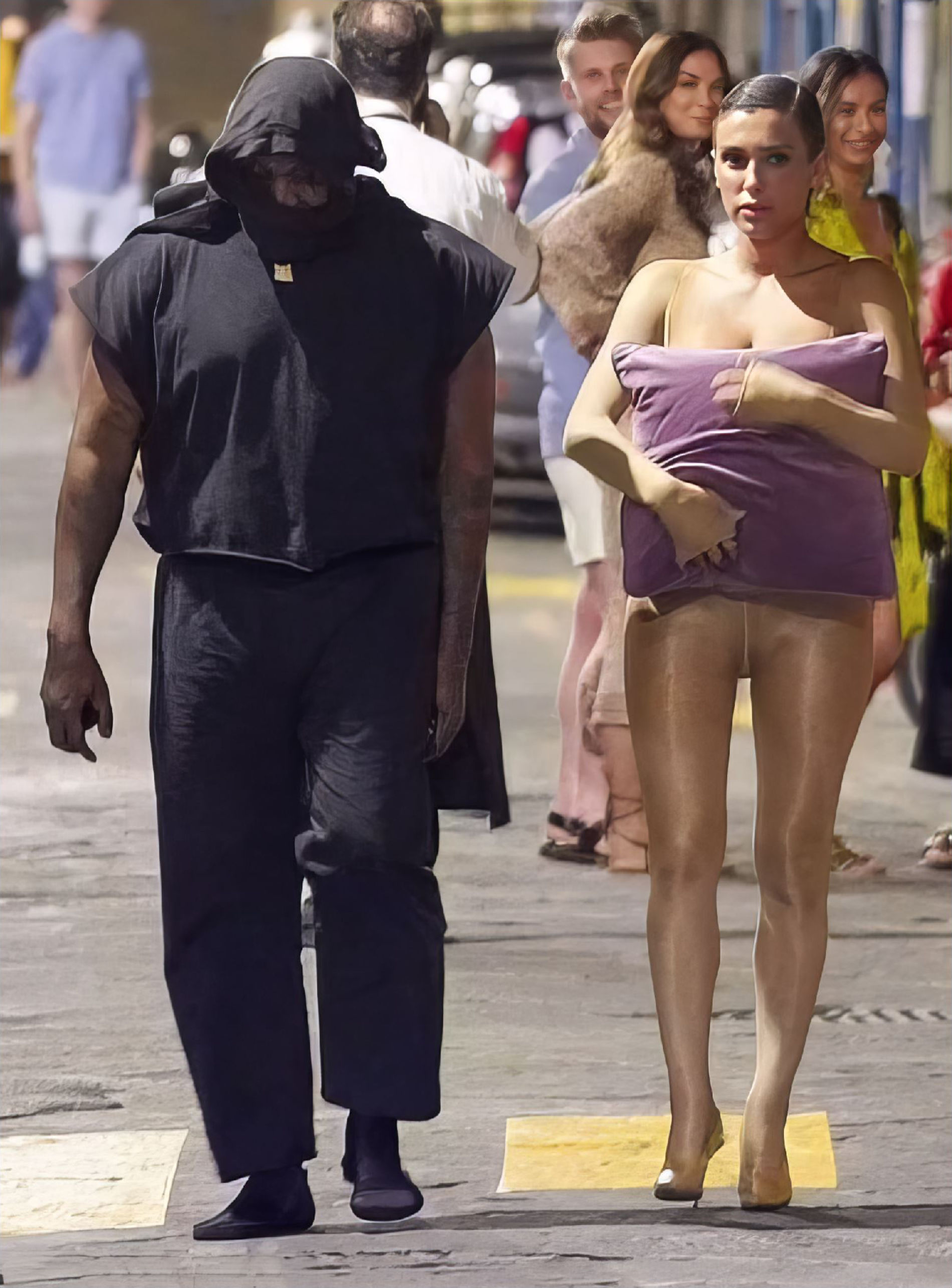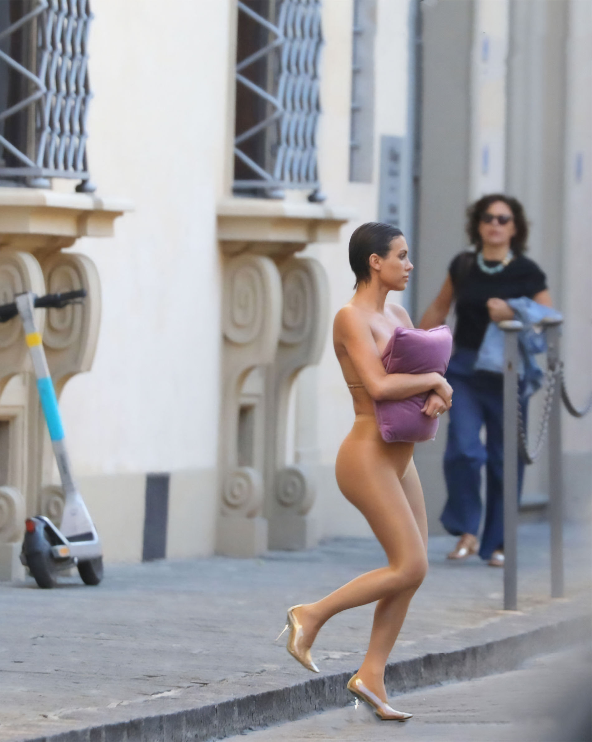 Бьянку заметили в одних колгоках и с подушкой, когда она и ее муж рэпер Канье Уэст выходили из своей гостиницы во Флоренции 6 сентября 2023 года.