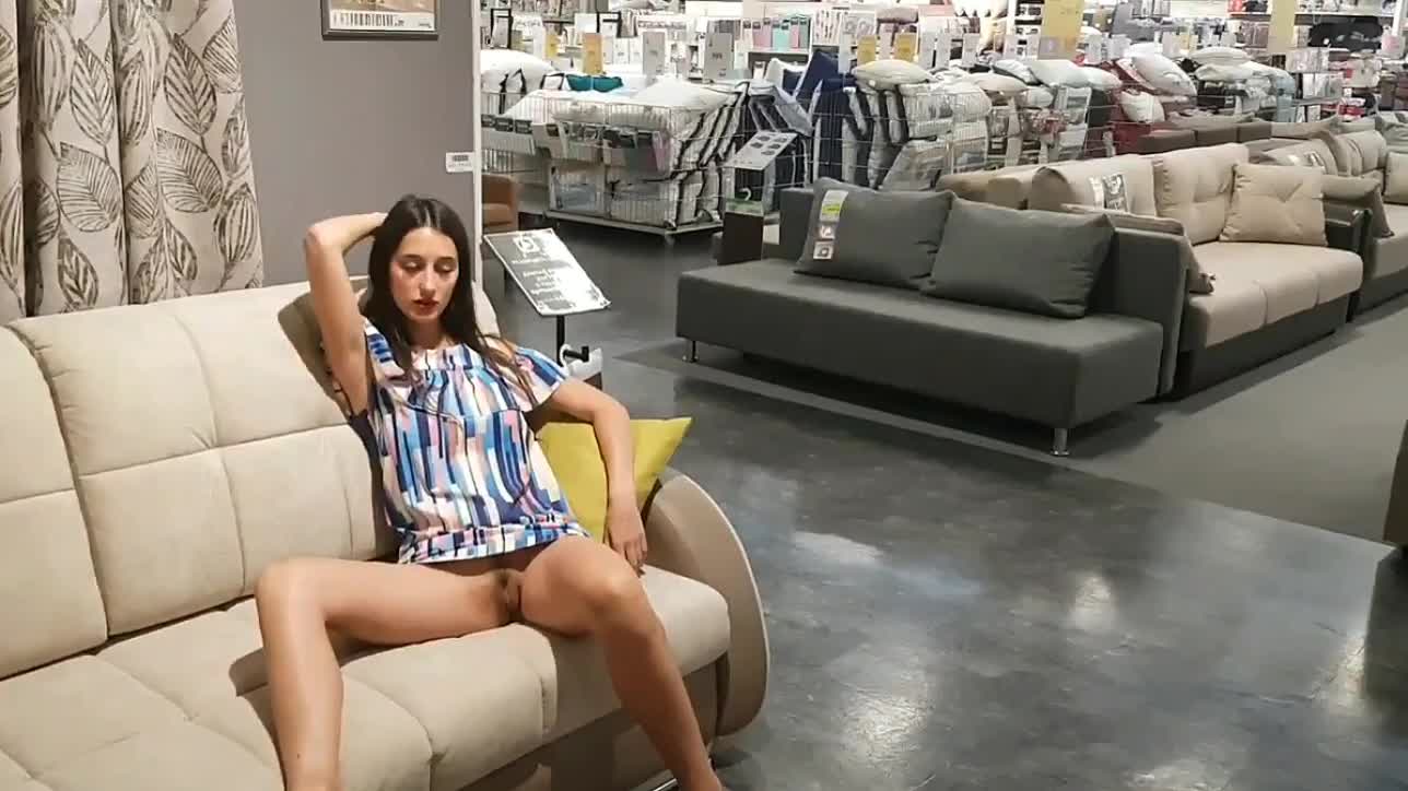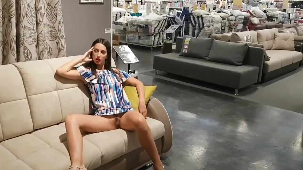 Деваха без трусов, в мебельном магазине, показывает свою писюху.