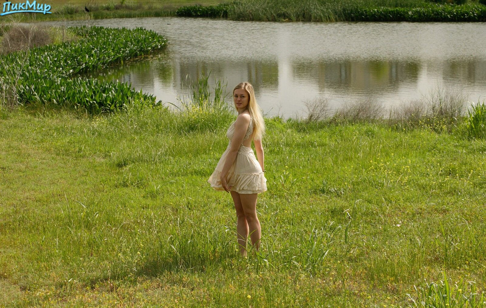 Улыбающаяся блондинка раздевается догола на лугу у озера.